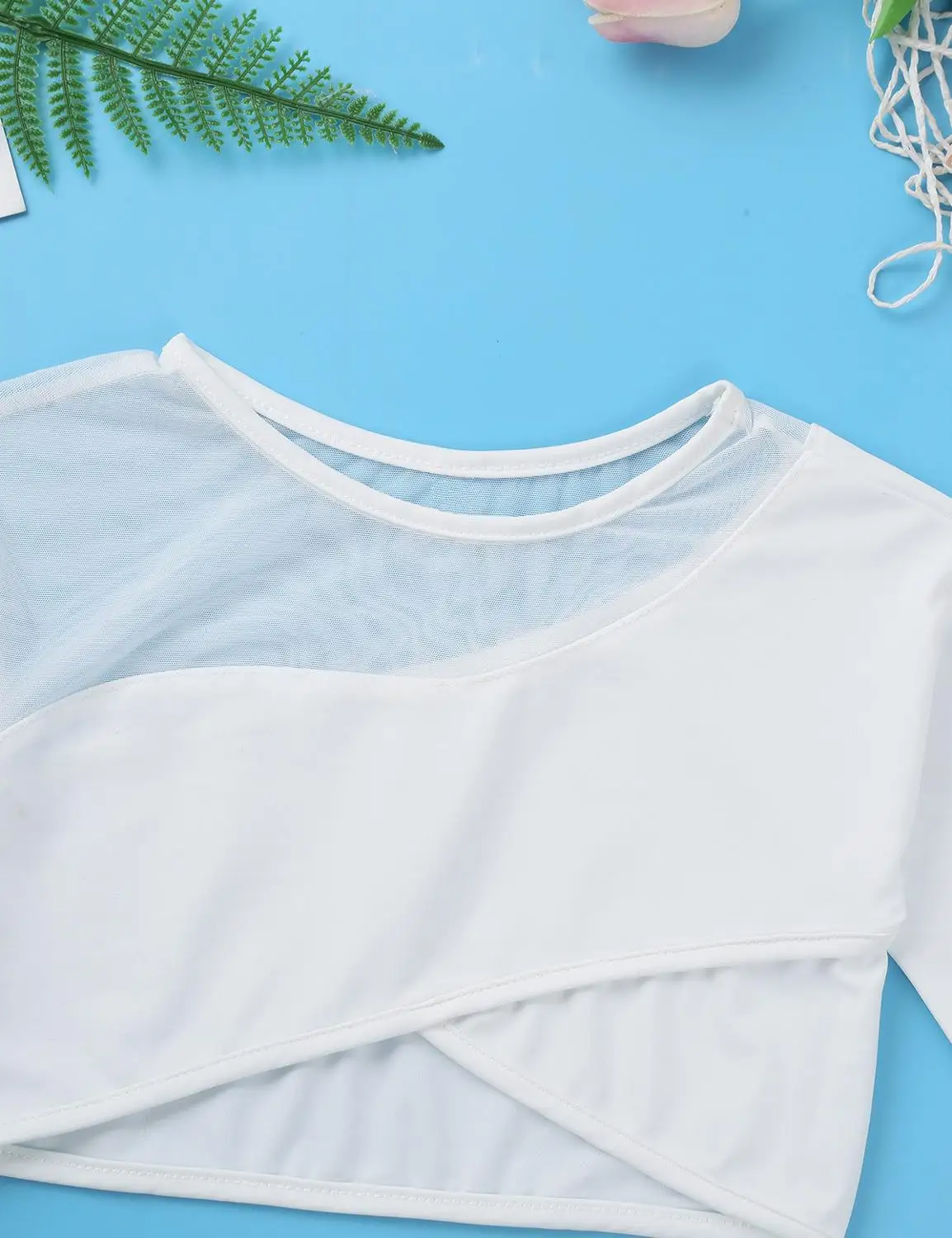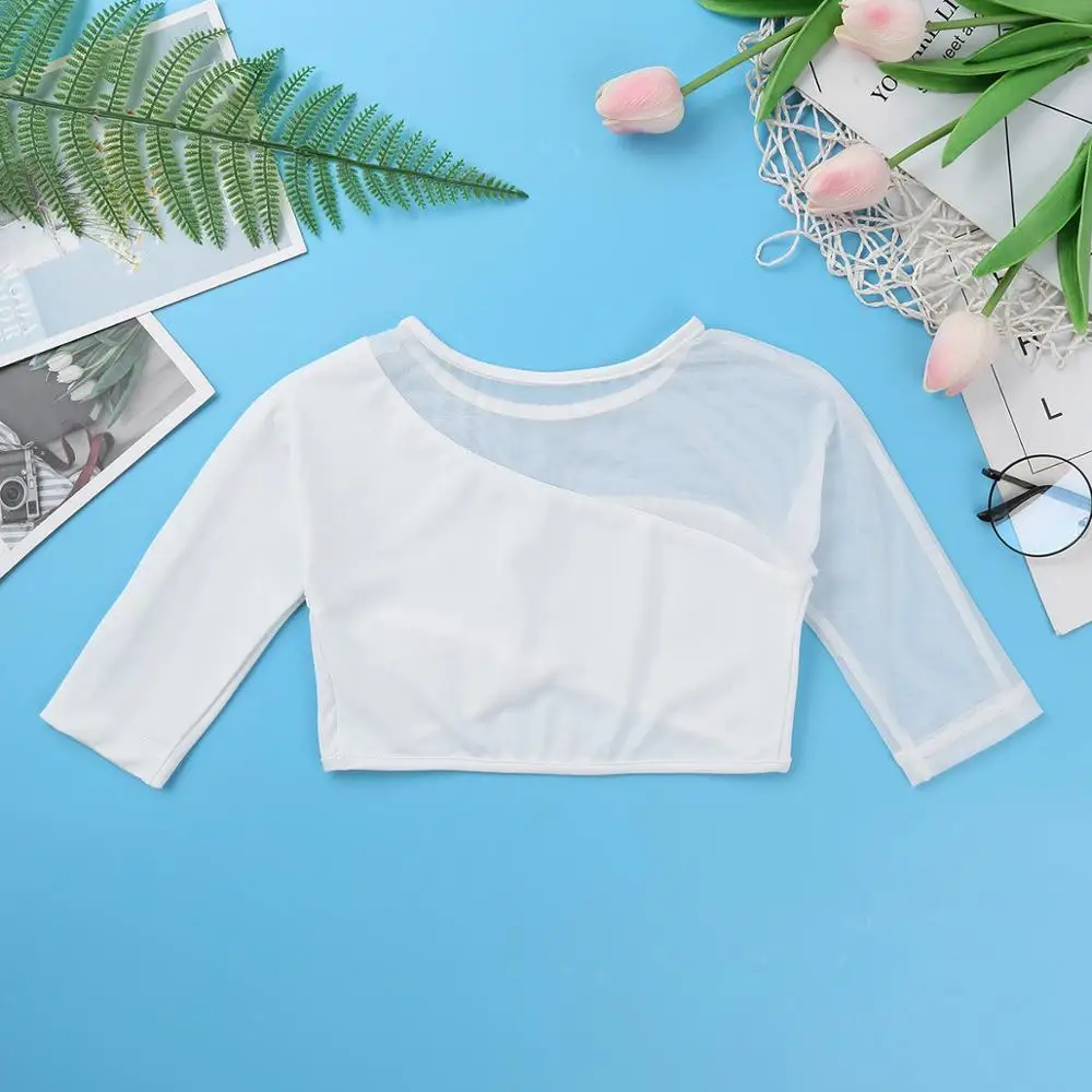 Особенности: Укороченный топ изготовлен из полиэстера, спандекс и сетка, ручная стирка. Таблица размеров означает возрастные диапазоны для девочек, но они приведены только для общего ознакомления. Особенности: 3/4 рукава, асимметричный сетчатый вырез и рукава и соответствующий асимметричный низ. Застежка на липучке. Эластичная ткань, дышащая, мягкая и удобная в носке. Модные топы для вашей девочки. Идеально подходит для занятий балетом, танцами, выступлений на сцене, тренировок и т. Д.