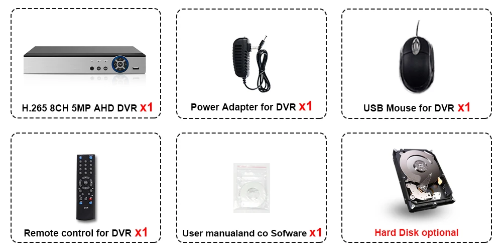 1 х H.265 8CH 5.0MP 6 в 1 AHD DVR гибридный цифровой видеорегистратор1 x Блок питания для DVR1 х USB мышь для DVR1 X CD программное обеспечение для DVR1 X пульт дистанционного управления для DVRЖесткий диск опционально!