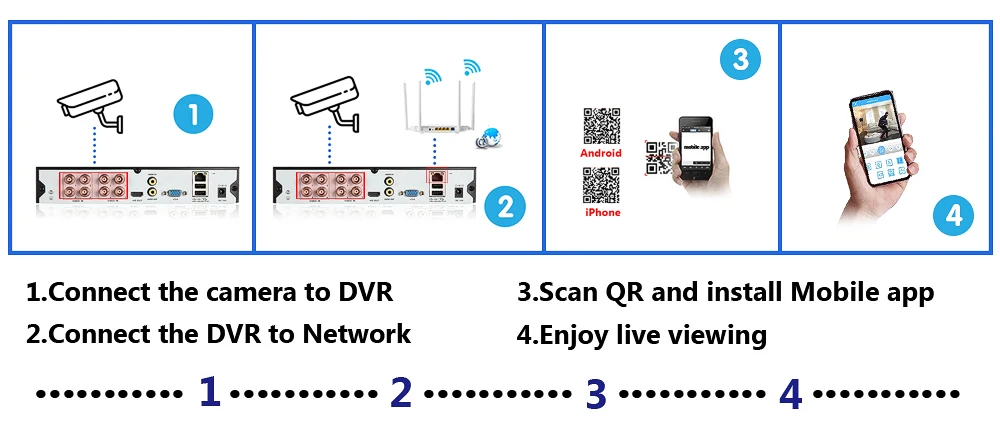 Простая настройка, всего 4 шага для просмотра мобильный телефон, просмотра видео в режиме реального времени из любого места и в любое время с помощью смартфона, стола или ПК с передовой технологией P2P, вы можете получить удаленный доступ к вашей системе за считанные минуты или меньше, нет необходимости в переадресации, удаленный доступ никогда не был таким простым!
