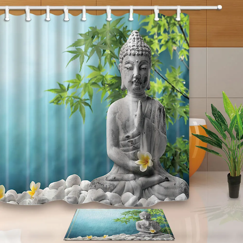 Ванная комната душевой занавески статуя Будды бамбуковое банное экраны домашний декор полиэстер ткань водонепроницаемый и устойчивый к плесени, украшенное мозаикой из драгоценных камней, 12 крючков