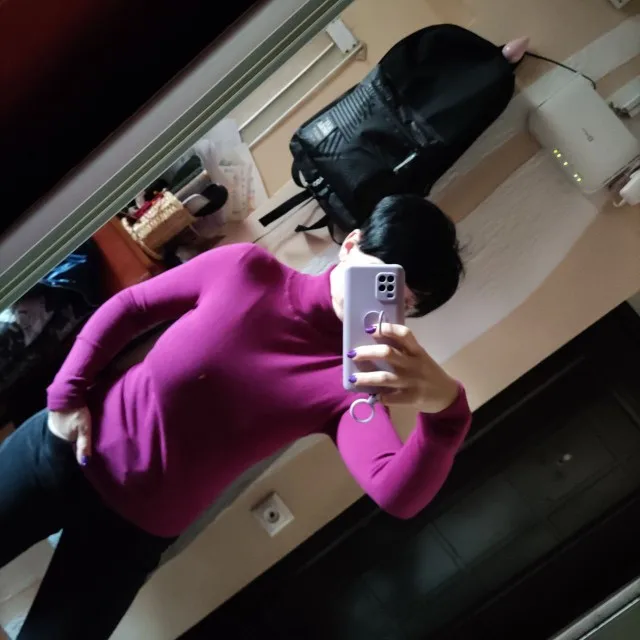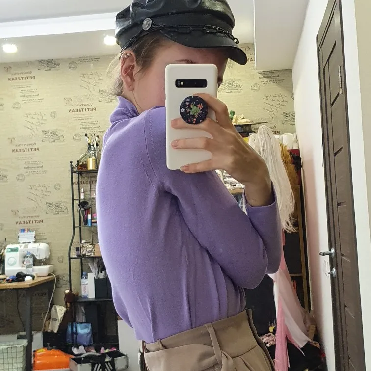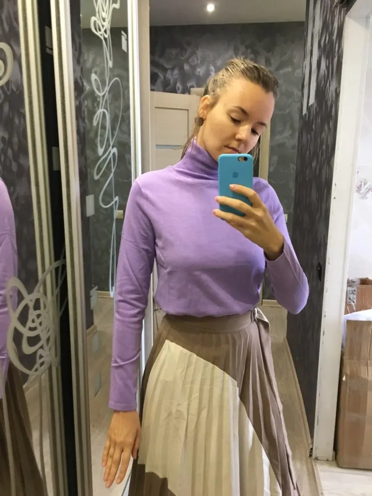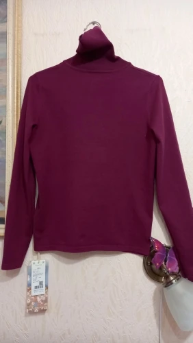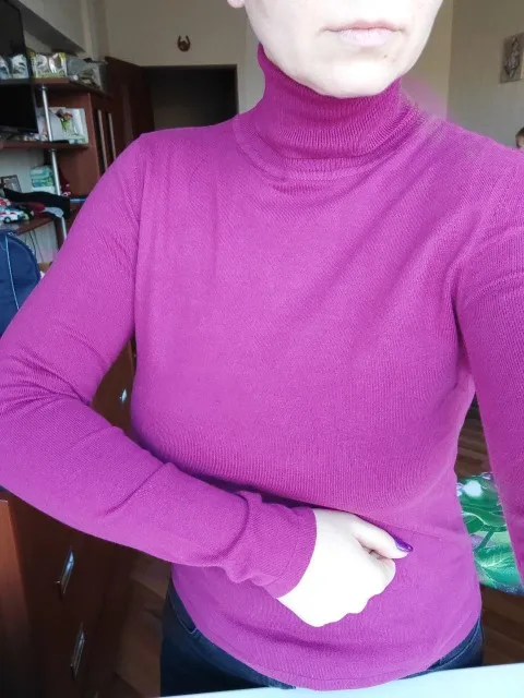 Симпатичная водолазка. Цвет бордово-фиолетовый, более блеклый. Измерения в размере М: плечи 36, грудь 88, длина 53, длина рукава 58 - отличие от таблицы описания. Ношу S-M, грудь 90, рост 160, села чуть свободно, так и ношу водолазки. Очень мнется. Доставка на Южный Урал 16 дней в 5-ку. Благодарю.