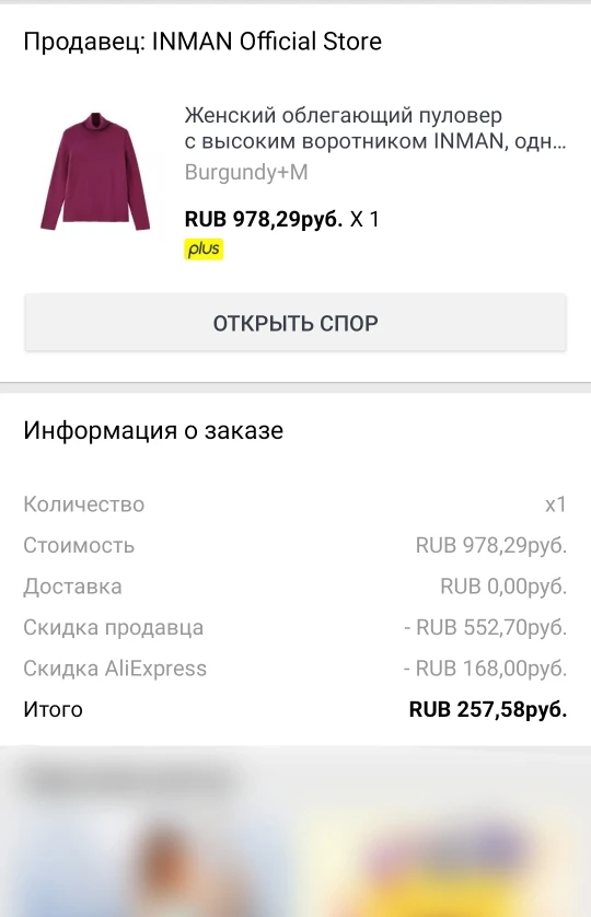 Заказала 3 вещи 11.11, чтобы получить скидку, а в итоге, продавец просто не положил одну из вещей (вот эту водолазку) Очень печально. Спор закрыли не в мою пользу. Связалась с продавцом, он отправил трек номер для отслеживания с такой же водолазкой, которая была заказана позже и соответственно с другой оплатой. Сама водолазка замечательная, мягкая. За качество 5 звёзд. А по итогу, продавец деньги получил, а товар не отправил. Конкретно по этому товару оценивать нечего.