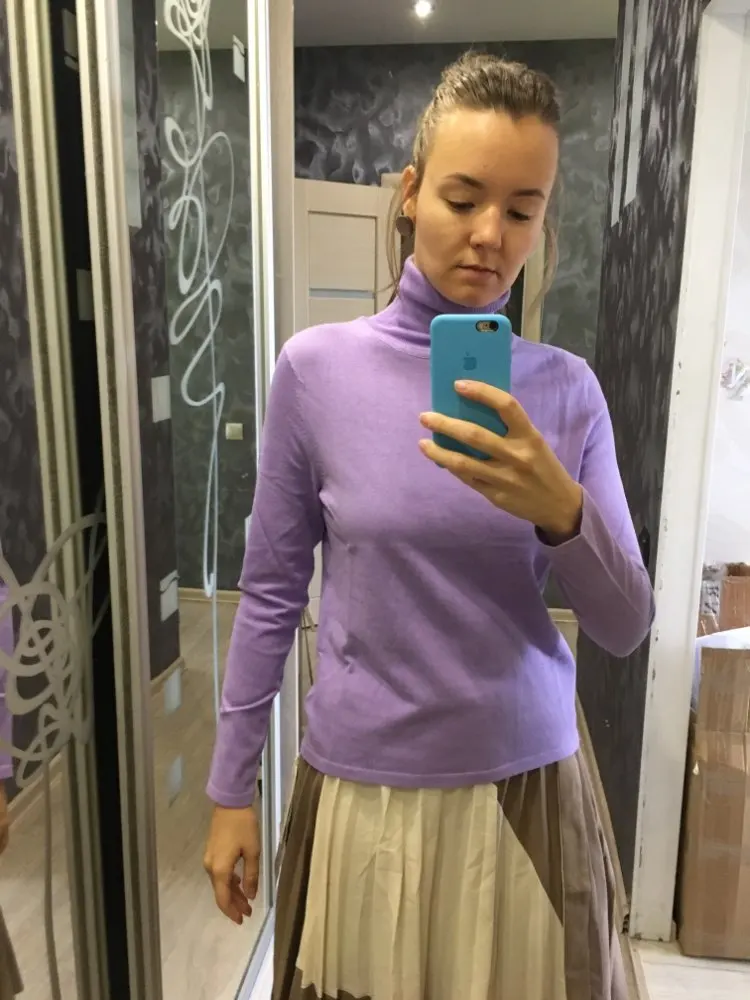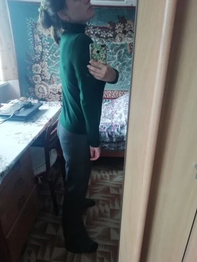 Водолазка хорошая. На 87-70 взяла размер М. Немного свободно но мне нравится. И горловина немного давит. Хотя у меня худая и длинная шея. При первой стирке было много мелких ворсинок. Но на теле после носки я их не замечаю.