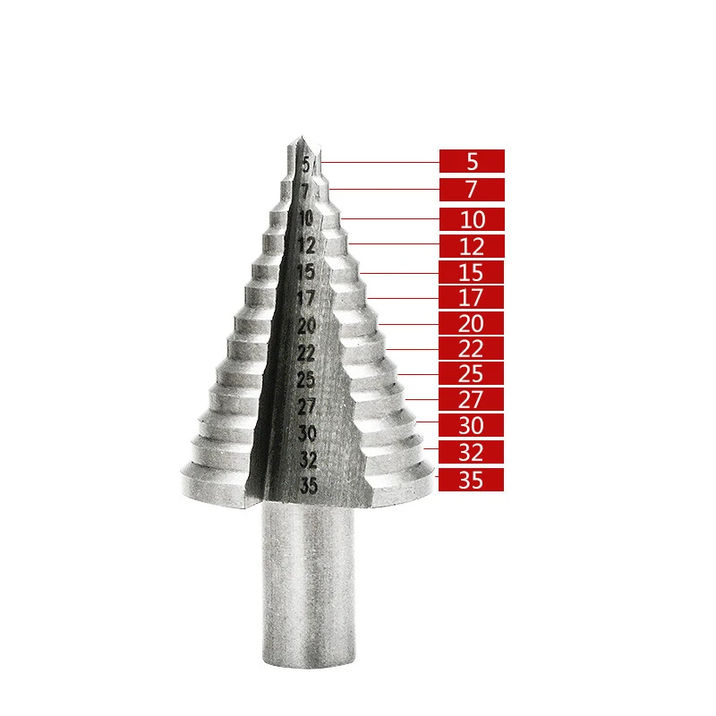 Особенности: 5-35mm -13 шагов: 5/7/10/12/15/17/20/22/25/27/30/32/35 мм Материал: Высокоскоростная сталь (подходит для использования на заготовке, твердость 28 градусов, таких как Алюминий, плита, изоляционная доска, ПВХ доска, дерево, толщина листа ниже 3 мм) Обработка поверхности: белый бриллиант Посылка включает в себя:1 * ступенчатое сверло