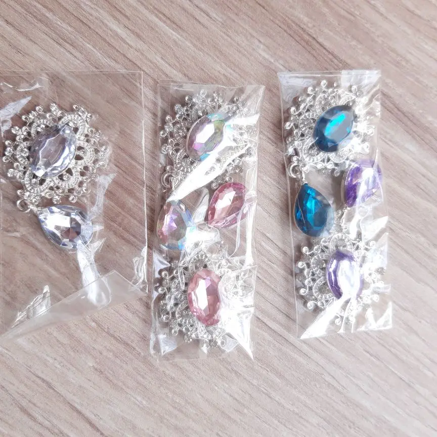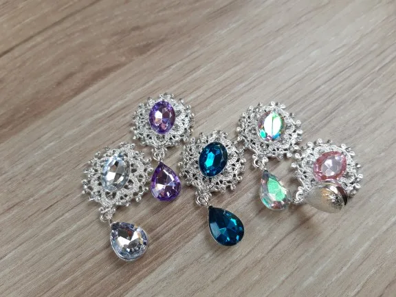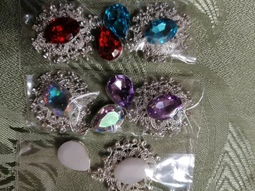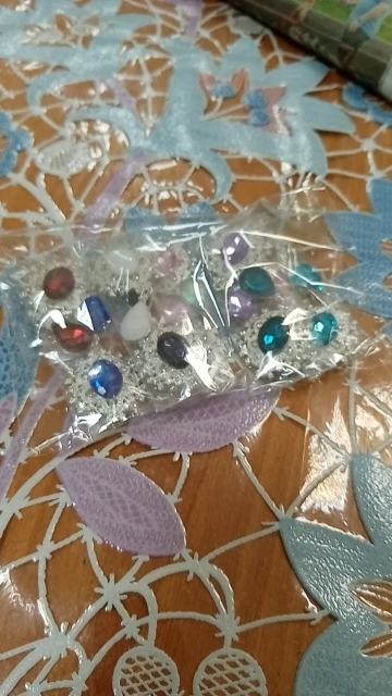 Доставка в Калугу достаточно быстрая. Упаковка отличная. По 1-2 ювелирной серединке в пакетике, и потом все эти 3 пакетика еще разложены аккуратно в квадратный пакетик по размеру. Стразики все на месте, но на некоторых серединках на капельки криво наклеен камень (белая, розовая, темно-бирюзовая), на бирюзовой и центральный камень наклеен криво, и еще и на всех камнях еще по бокам по сколу (как будто эти камушки были на ножках и их откололи от них, но у каждого камушка они в разных местах). А на прозрачной кристальной (АBS) серединке покрытие капельки все зашоркано, поцарапано.