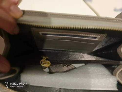 Доставка быстрая, за 10 дней пришла в город доставки. Упакована была в пакет, с двух сторон обложена картонкой, сверху обычный пакет для посылок с пупыркой. Сумочка тактильно приятная, мягкая. Кармашек для телефона узковат, если телефон большой, да ещё и в чехле, на кнопку закрываться не будет. Второе отделение внутри разделено небольшим кармашком, имеются два картхолдеры на 3 карты каждое. Длина лямки примерно 135-136см, если фиксатор сдвинуть к самому низу. С продавцом не общалась.