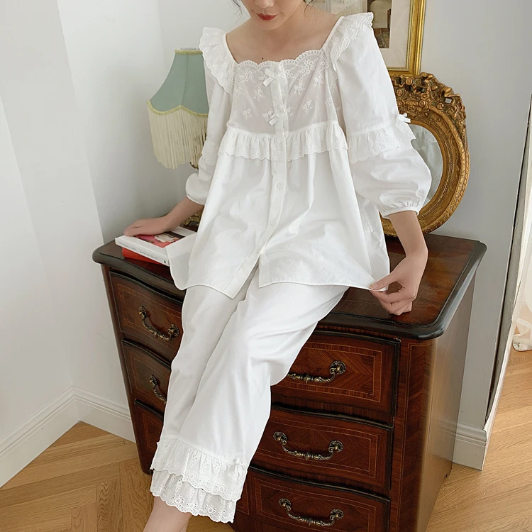 Женский пижамный комплект Лолита с квадратным воротником, топ с вышивкой и длинные штаны, винтажный пижамный комплект, одежда для сна в викторианском стиле, домашняя одежда