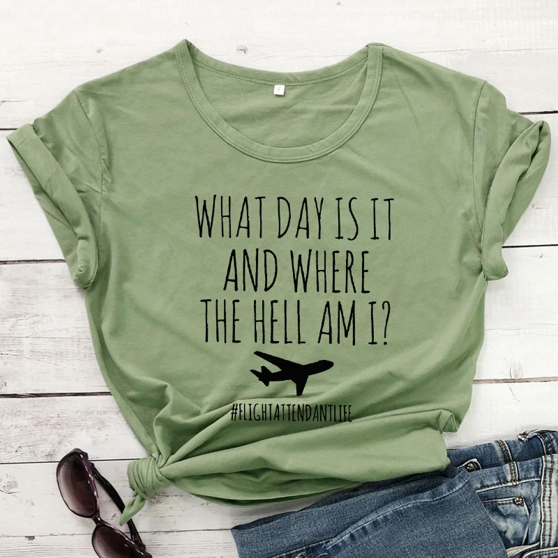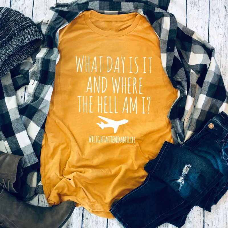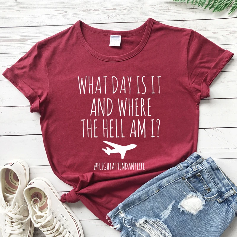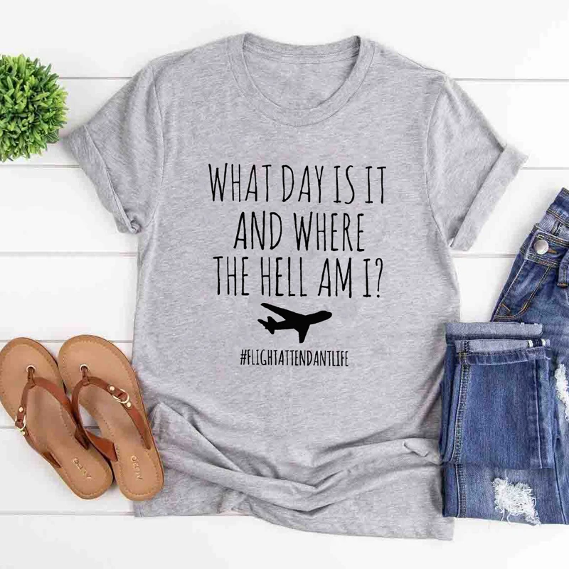 Какой день это и где, к черту, я, стюардесса, Жизнь футболка Веселая самолет режим футболка с принтом женская футболка одежда