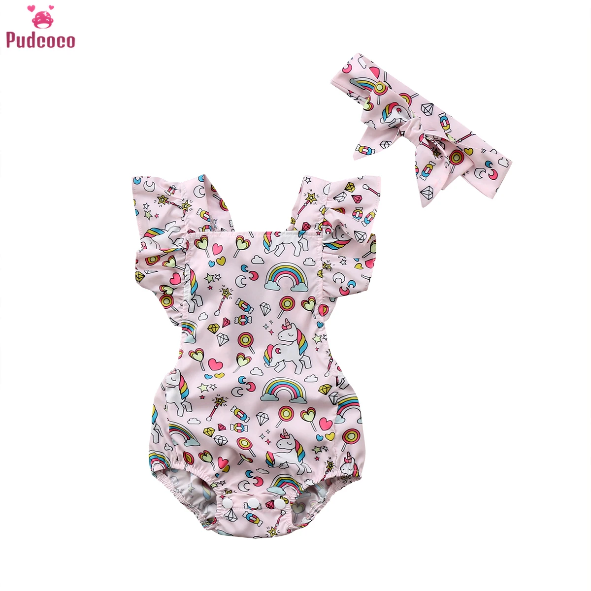 С принтом Радуга Единорог новорожденных одежда Одежда для новорожденных девочек с милой кружевной оборкой комбинезон без рукавов повязка на голову, летняя одежда