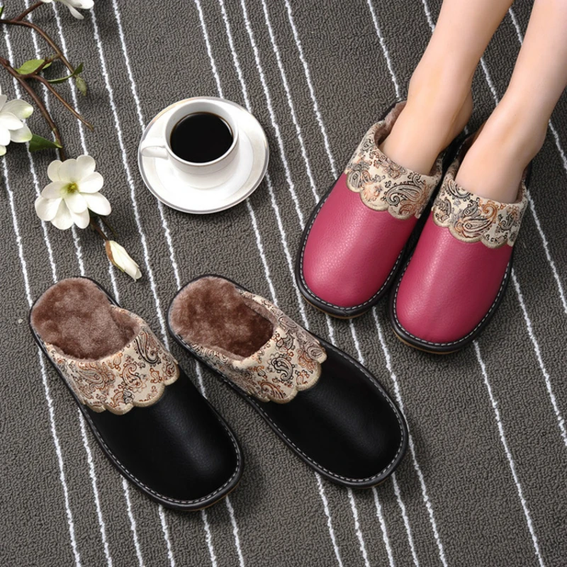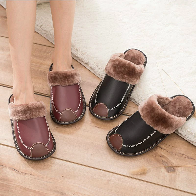 Меховые женские домашние тапки, искусственная кожа, Нескользящие, теплые, плюшевые, сланцы, большие размеры