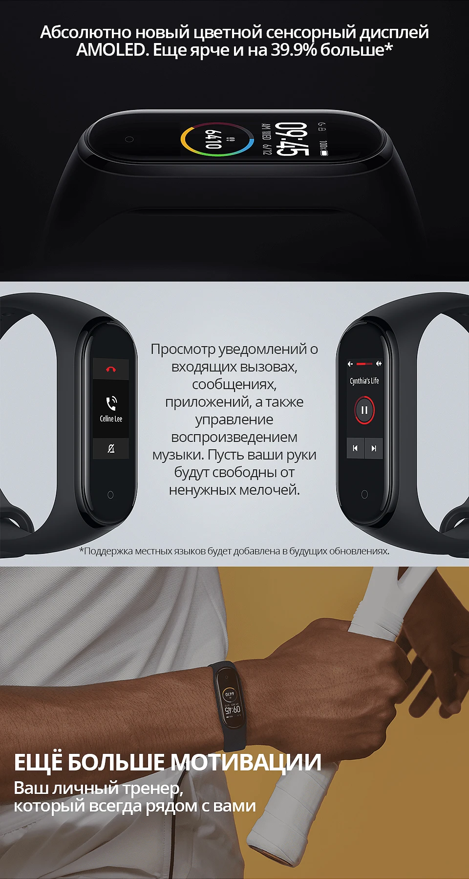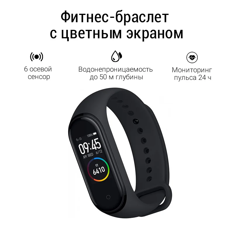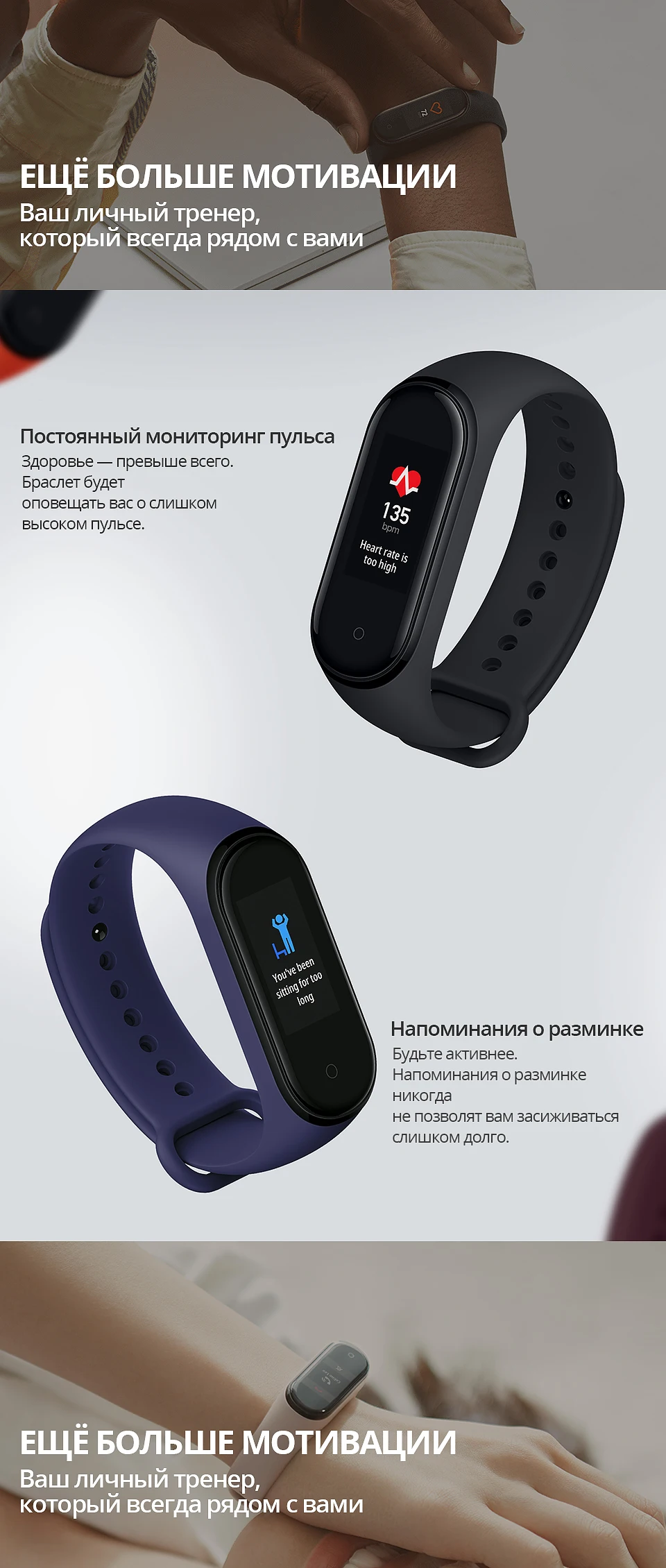 Смарт-часы Xiaomi Mi Band 4 водонепроницаемые, с пульсометром, Русская версия