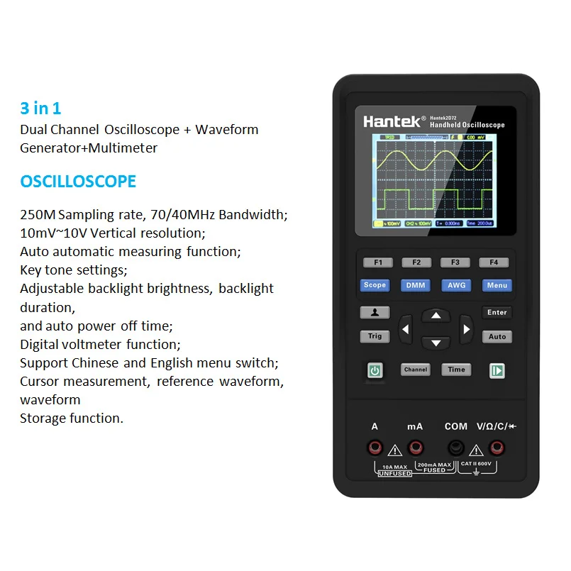 Цифровой осциллограф Hantek 3 в 1 + генератор сигналов + мультиметр USB, 2 канала, портативный 40 МГц 70 МГц, ЖК-дисплей, измерительный измеритель, инструменты