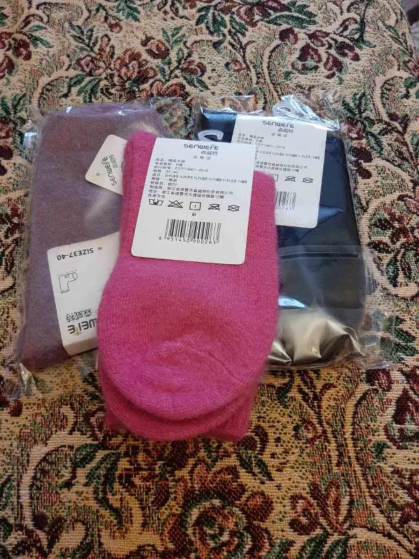 Доставка до Латвии довольно быстрая - 6 недель. Носочки мягкие и теплые, но в реальности цвет темнее, чем на фото. Заказывала три пары разных цветов, и все носки разных размеров. На вид довольно маленькие, примерно 36-37 размер. Покупала в подарок, как тянуться не проверяла.
