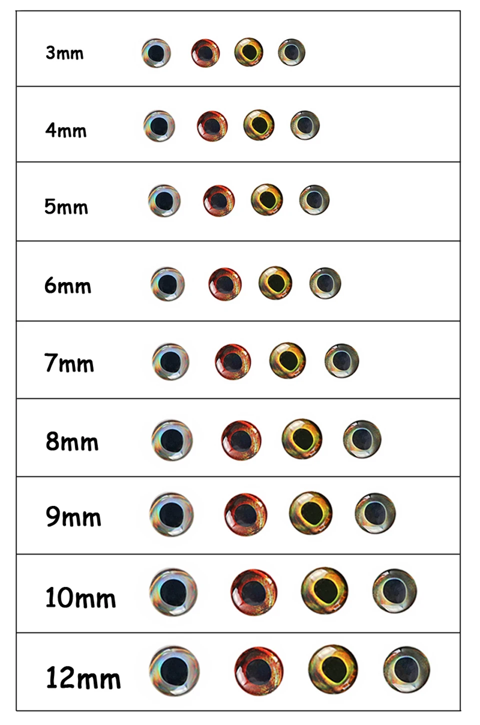 На самом маленьком размере глаз (3 мм) разница между цветами не так хороша, как на больших размерах, но это ожидалось. Все в целом, очень доволен ими.
