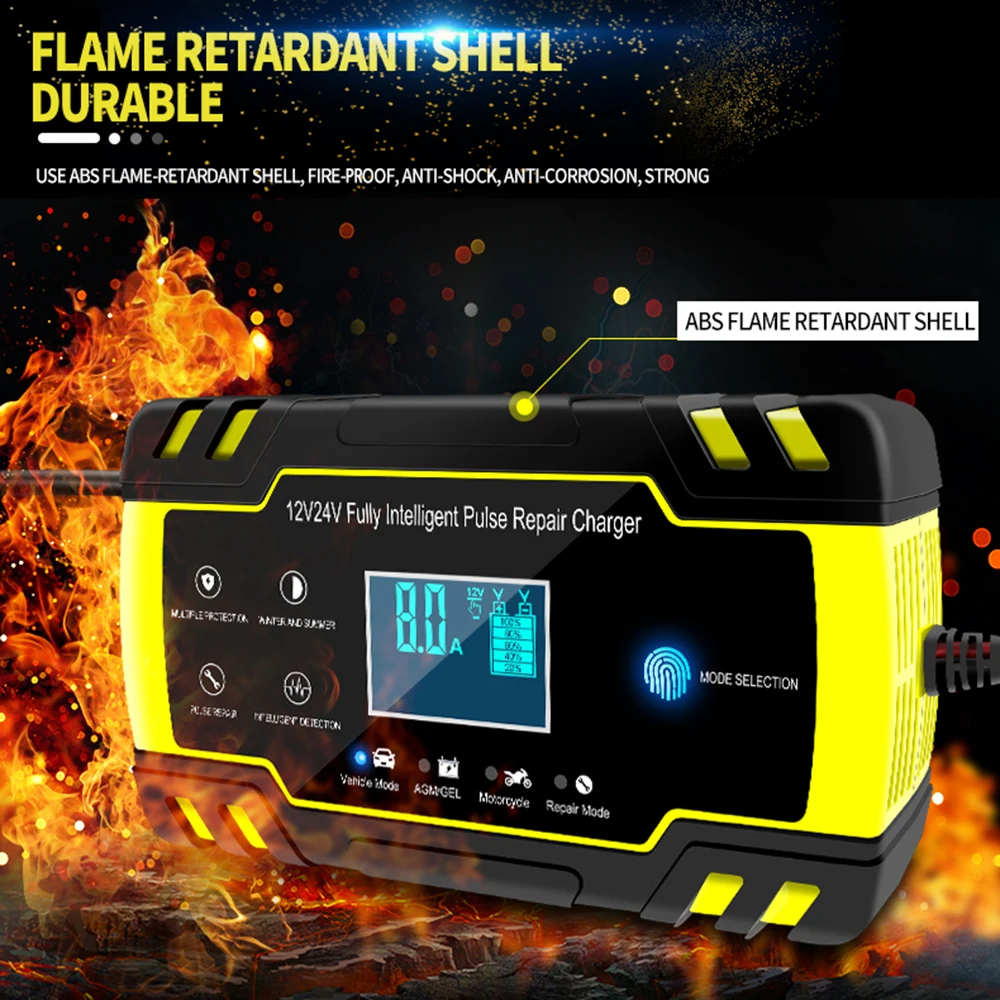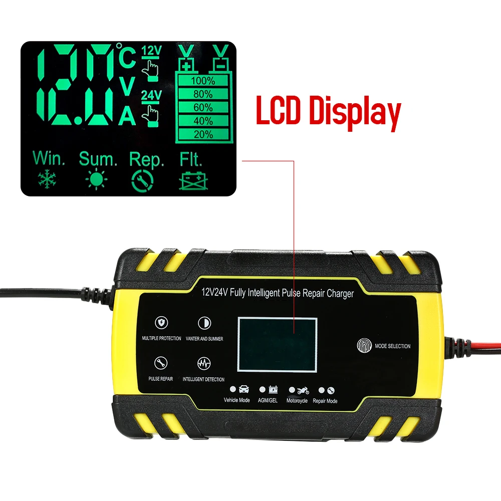 Особенности:Высокая эффективность(>82%).Трехступенчатый процесс зарядки с микропроцессором обеспечивает наилучшее применение и эффективную зарядку аккумулятора.Напряжение зарядки адаптируется к температуре, чтобы предотвратить чрезмерную или пониженную зарядку аккумулятора.Возможность подзарядки сильно разряженной или сильно сульфатной батареи.Защита от обратной полярности, защита от короткого замыкания, свободный контакт искр.ЖК-дисплей, напряжение, ток, температура и так далее.Простота использования, четкое отображение состояния зарядки.Спецификация:Вилка:Вилка ЕС, вилка США, вилка Великобритании(Необязательно)Тип: умный и автоматическийВход переменного тока: 100-240 В, 50/60 ГцВыходное напряжение: 12 В/24 В АвтоВыходной ток: 12 В, 8 А и 24 В, 4 аВыходное напряжение без нагрузки: 13,8 ВМинимальное Начальное напряжение:> 2,0 вВходная мощность с нагрузкой: макс. 130 ВтВходная мощность без нагрузки: 3,2 ВтОхлаждение: ВентиляторРазмер изделия: 17*9,8*5,8 см/6,69*3,86 * дюймаВес изделия: 560 г/19,75 унцииПосылка: 23,2*13*6,6 см/9,13*5,12 * 2.60inВес посылка: 648,3 г/22,87 унцииПосылка тация:1 зарядное устройство1 * Руководство пользователя