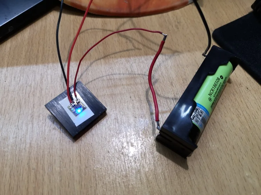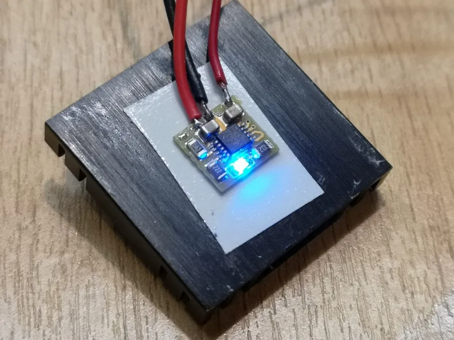 Заменил резистор на 1кОм, как в даташите, потому что мне не нужен большой ток. Приклеил на терморезину к плате, чтобы тепло лучше рассеивалось. Нет окончания заряда, подходит только для защищённых аккумуляторов. В таком виде, как продается, греется очень сильно.