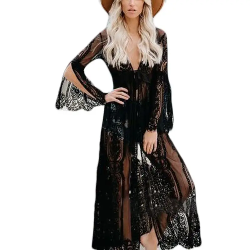 Длинные расклешенные рукава с разрезом, Открытый спереди кардиган, Макси длина в пол, приталенный крой, сплошной цвет, сексуальное прозрачное полное цветочное кружево.