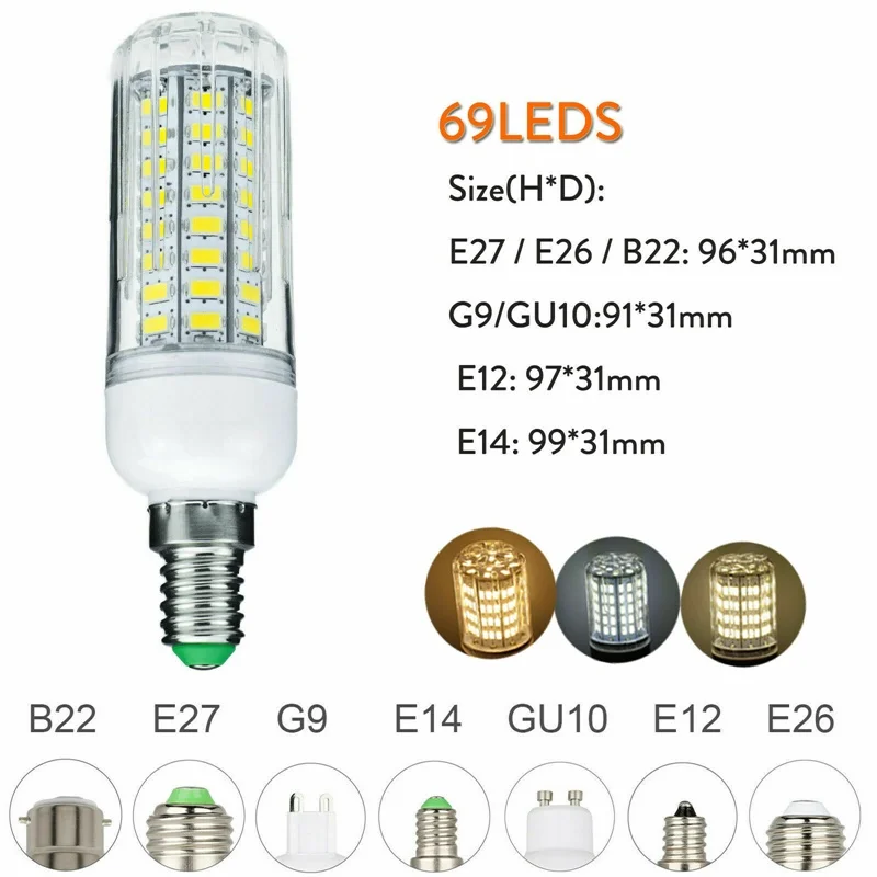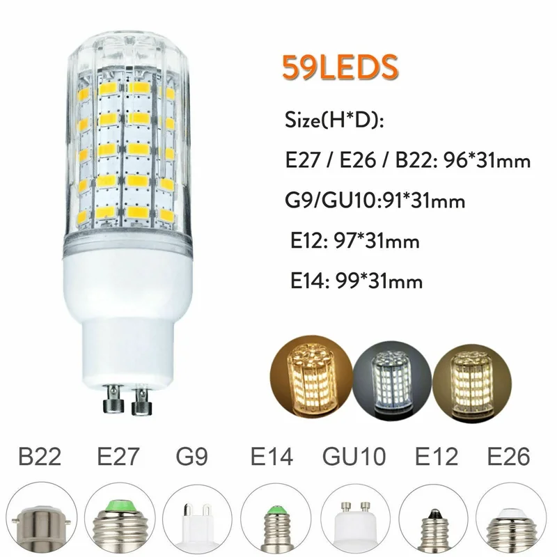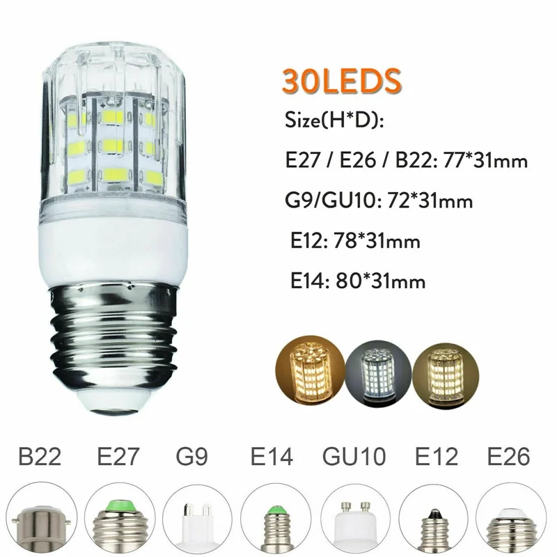 Тип цоколя: E26 / E27 / E12 / G9 / E14 / B22 / GU10 Напряжение: 110 В/220 В переменного тока; Светодиодный Тип: 5730 SMD Количество СВЕТОДИОДНЫЙ: 24 шт./27 шт./30 шт./36 шт./48 шт./56 шт./59 шт./69 шт./72 шт./96 шт. Световой поток: Светильник Цвет: белый/теплый белый/нейтральный белый/холодный белый Срок службы:> 50000 часов Цветовая температура: 6000-6500K (холодный белый); Нейтральный белый (4000-4500); 2800-3500K (теплый белый) Ультратонкое естественное освещение CRI> 80 Угол луча: 360 градусов Рабочая температура: от-20 ℃ до 60 ℃