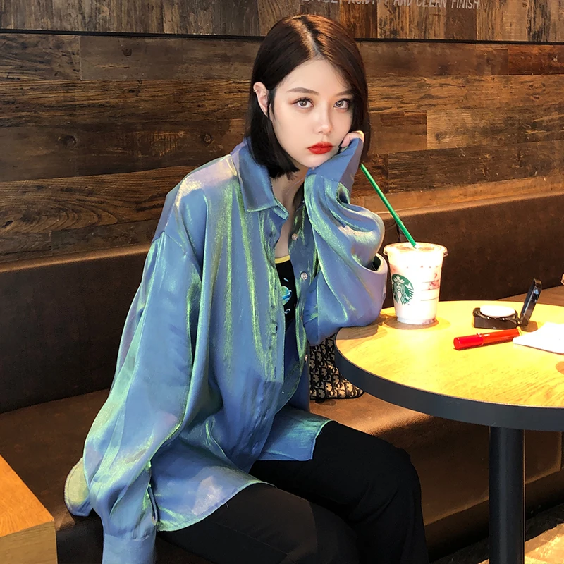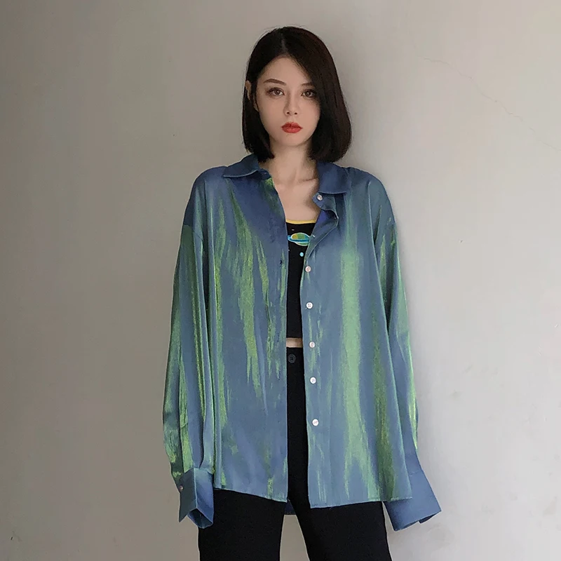 Рубашка действительно круто переливается. Материал чуток неприятный на голую кожу и не очень пропускает воздух, так что жарко, но в остальном товар отличный. Чуток овертайс вышел (на 168 см и 60 кг брала L), но на это и рассчитывалось.