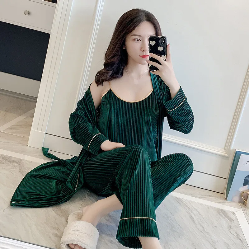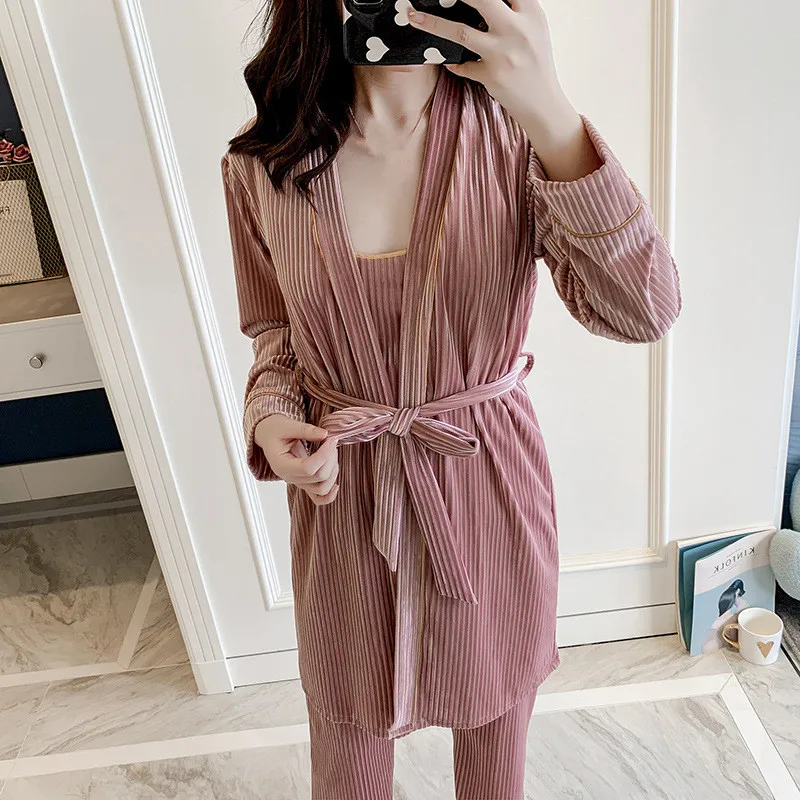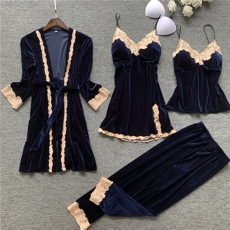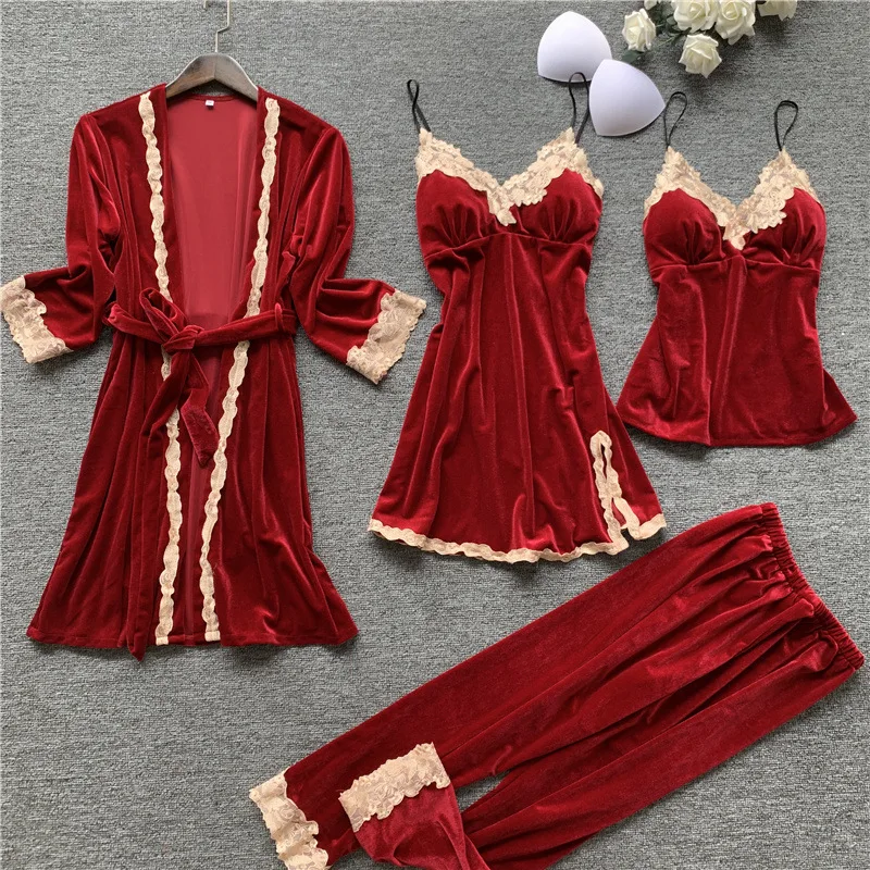 Осенние женские пижамные комплекты из 4 предметов, рубашка и халат, одежда для сна, бархатная Ночная одежда, пижамный комплект на бретельках для сна, пижама с нагрудной подушкой