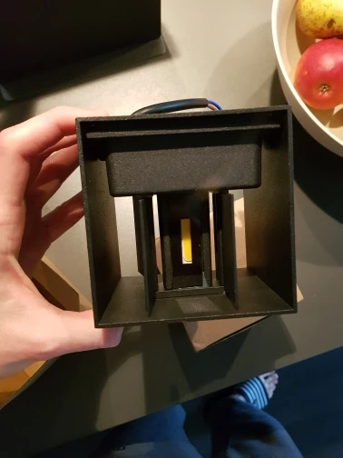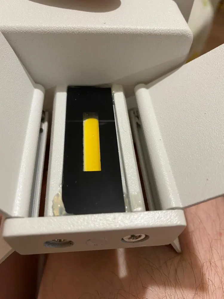 Качественный металл и краска работают нормально, но светодиодный cob меньше качества, см. Изображение: желтые стороны, которые видны на белой стене. И из-за транспортировки (2 шт.) один угол был поврежден