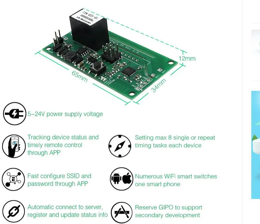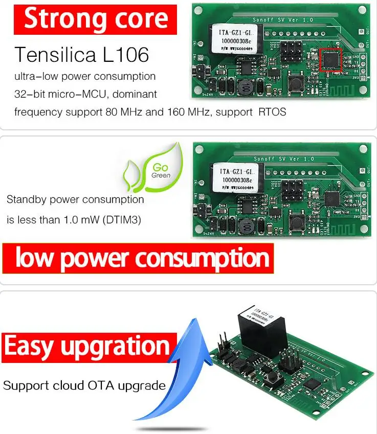 Sonoff SV (безопасное напряжение)-это версия Sonoff с низким питанием, которая поддерживает питание 5-24 В. Схема разделения мощности позволяет ей контролировать Питание переменного или постоянного тока для подключенного устройства, но вам нужно сделать некоторые сварки для реализации этой функции. Sonoff SV имеет GIPO защищены для поддержки вторичного развития. Эта версия не имеет функции 433 RF и без оболочки.