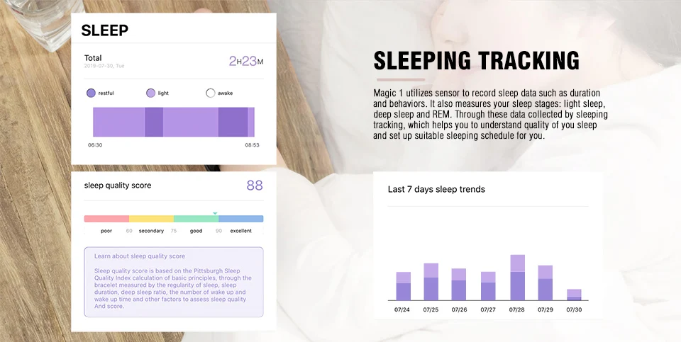 Magic использует датчик для записи данных о сне, таких как продолжительность и поведение. Он также измеряет стадии вашего сна светильник сон, глубокий сон и рем. Данные собираются с помощью отслеживания сна, что поможет вам понять качество вашего сна и установить подходящее расписание сна
