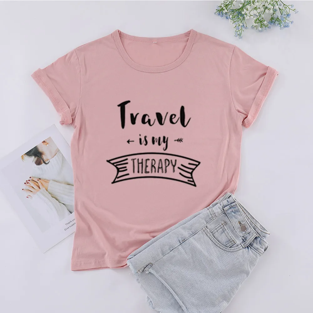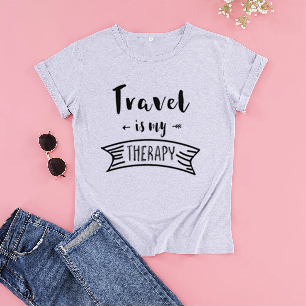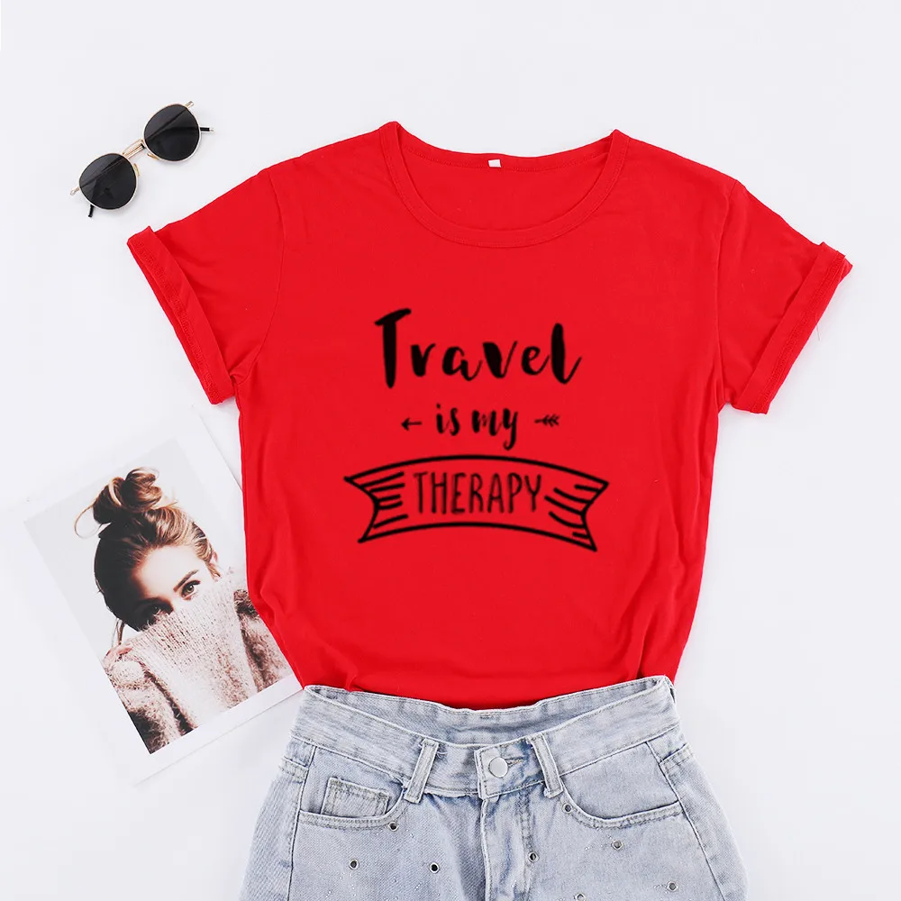 Женская футболка с короткими рукавами Travel Is My Therapy, хлопковая Футболка с круглым вырезом и надписью в Корейском стиле, большие размеры
