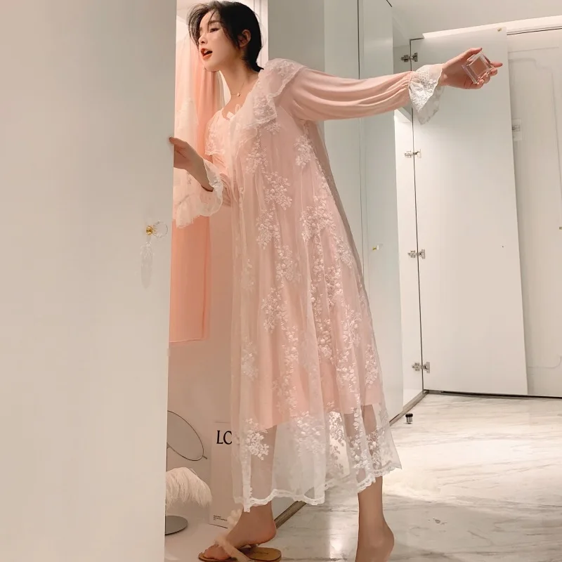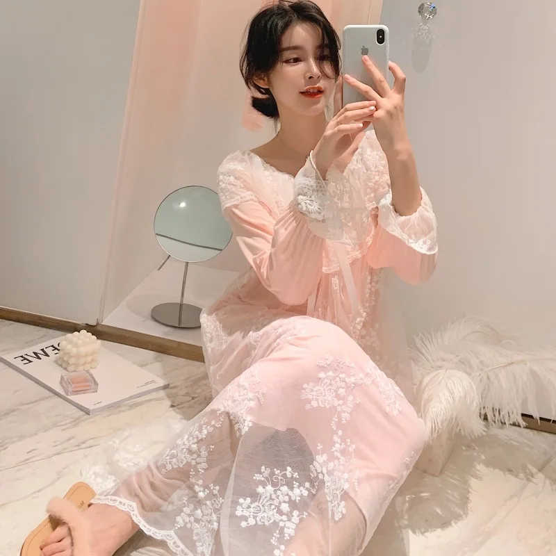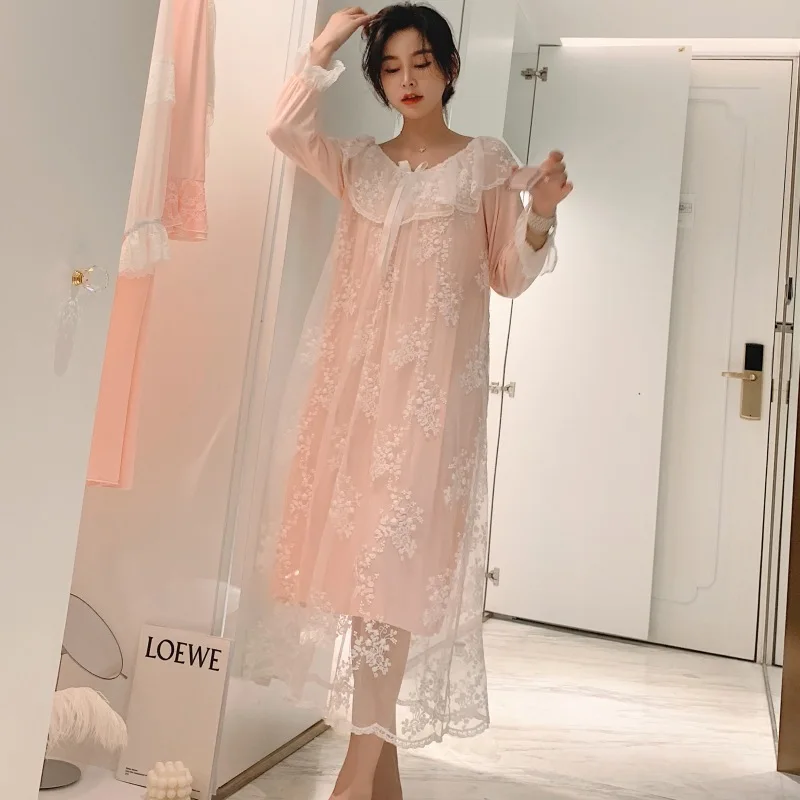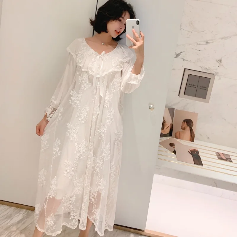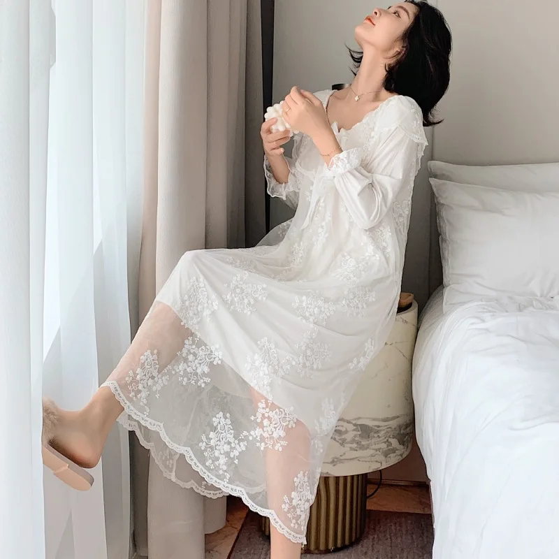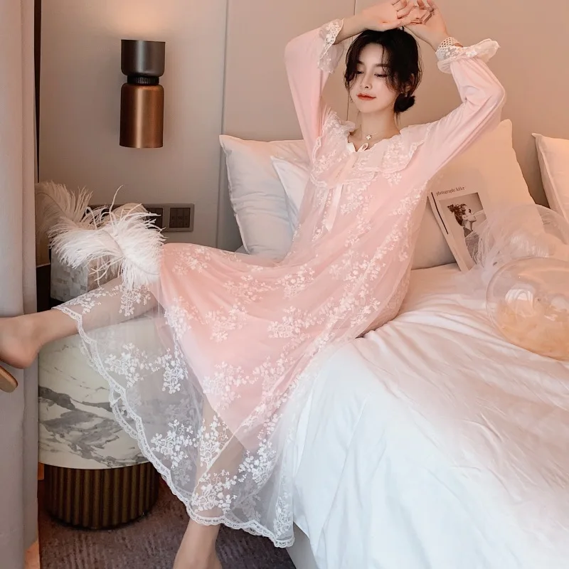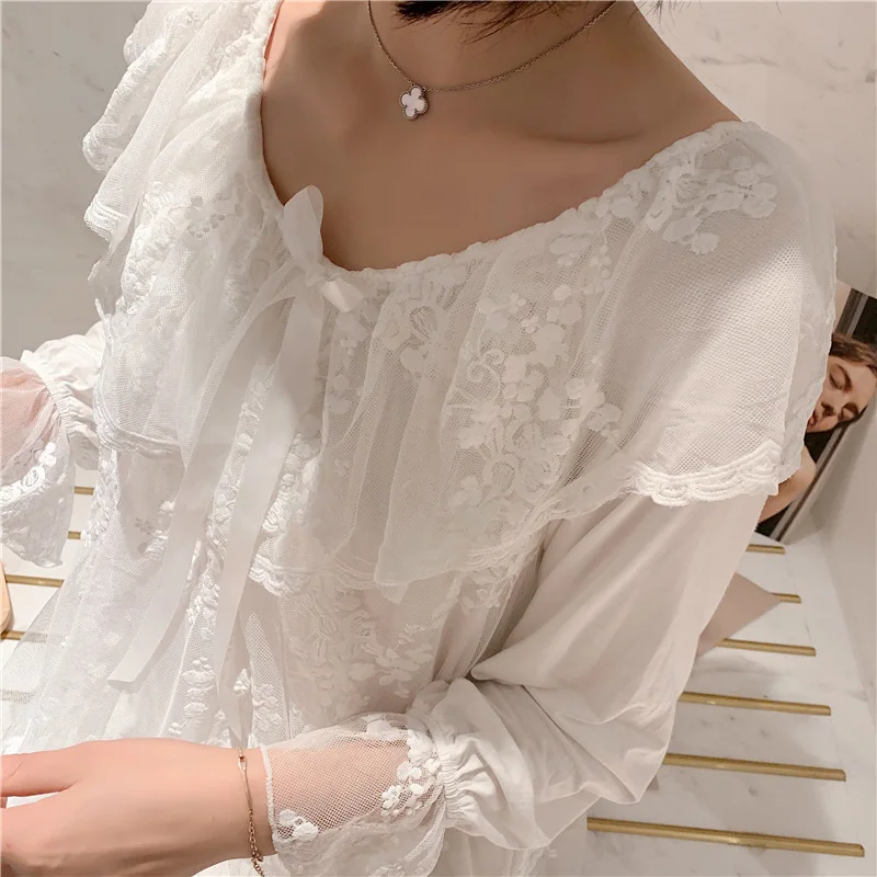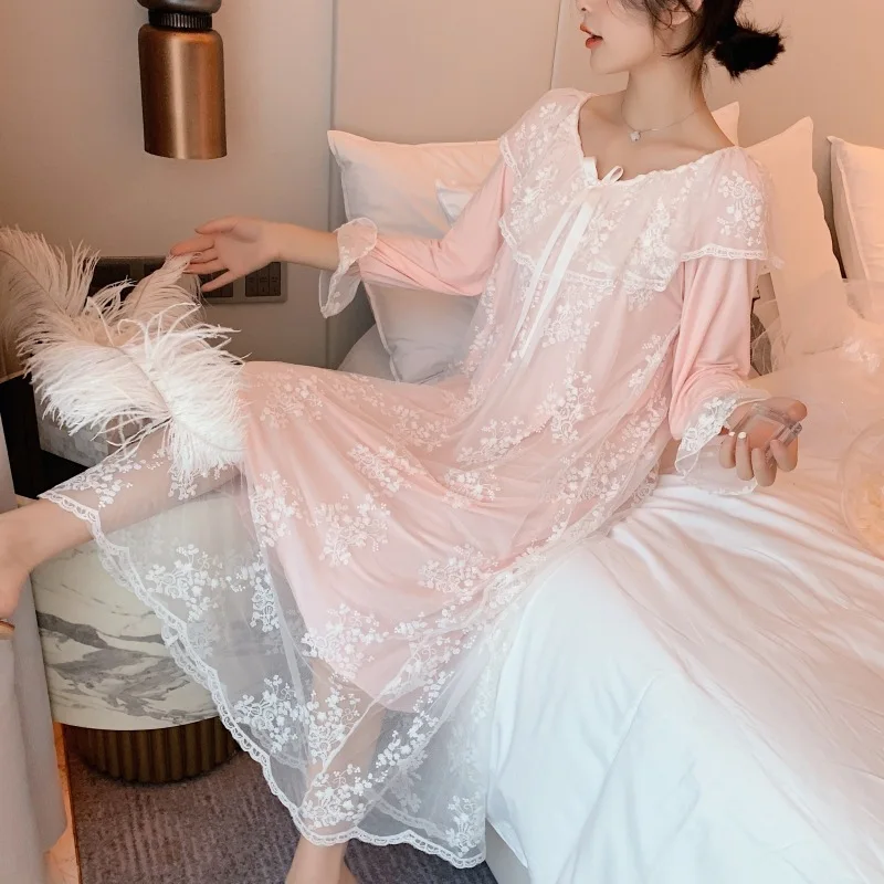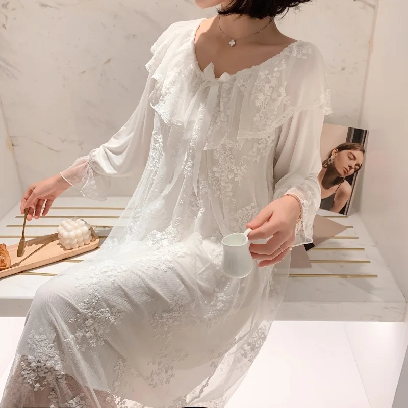 Lisacmvpnel осень новая вышивка кружева принцесса ретро женщина ночная рубашка длинный участок модал Сладкая Ночная сорочка