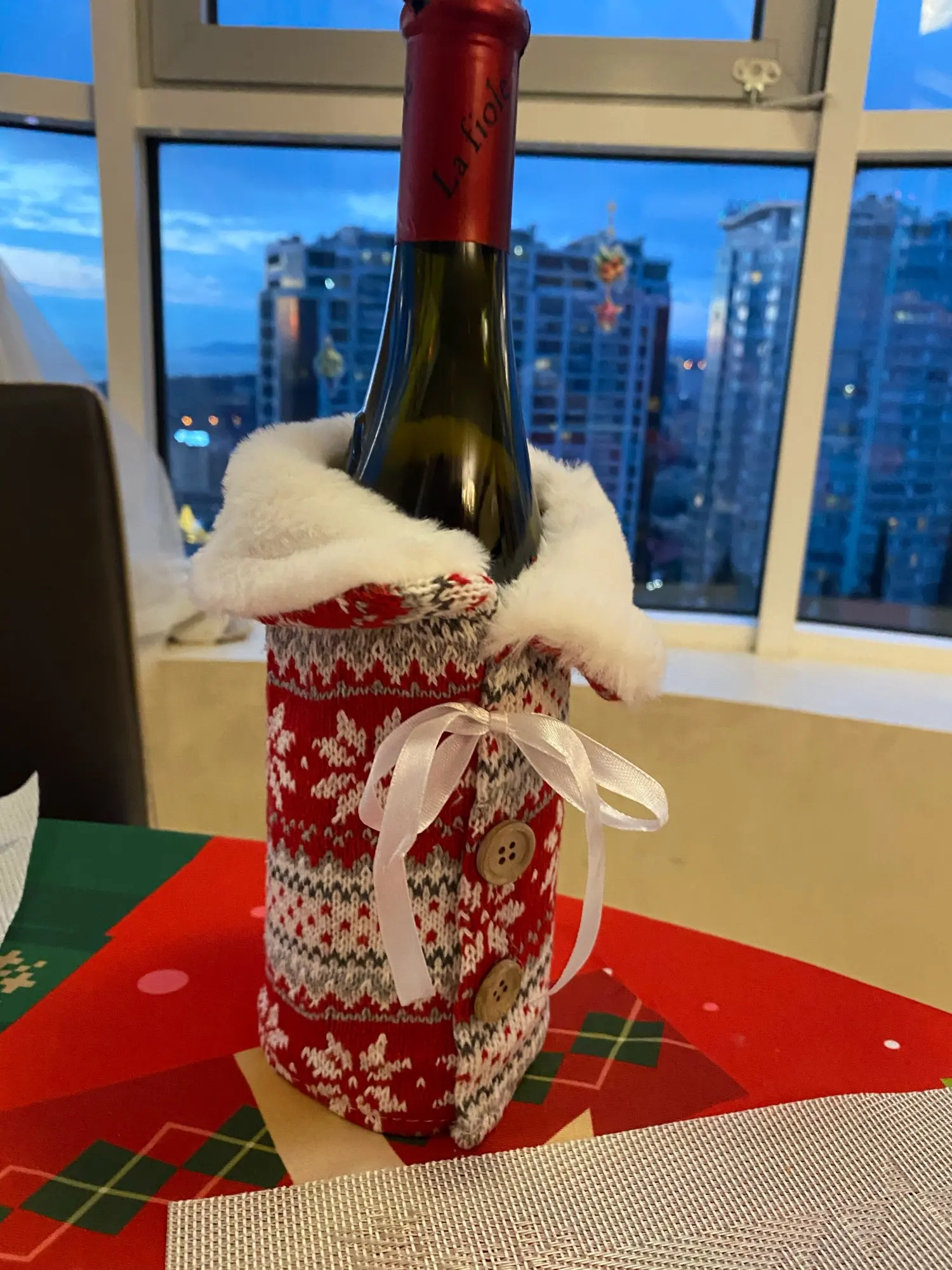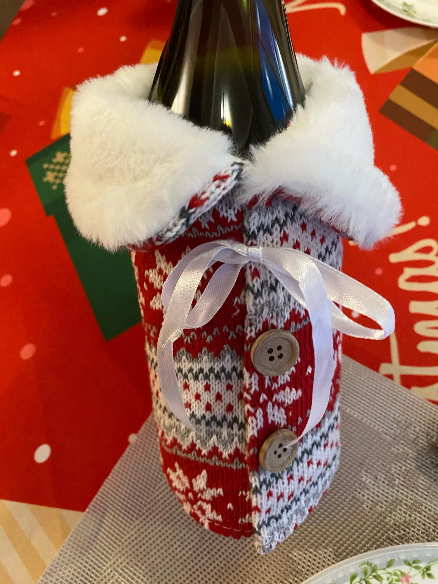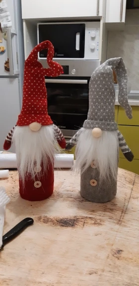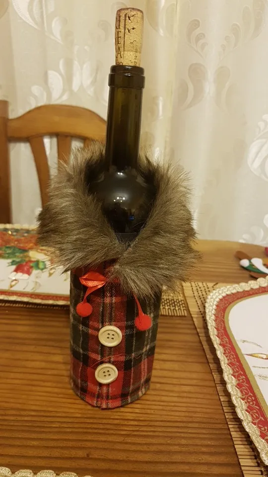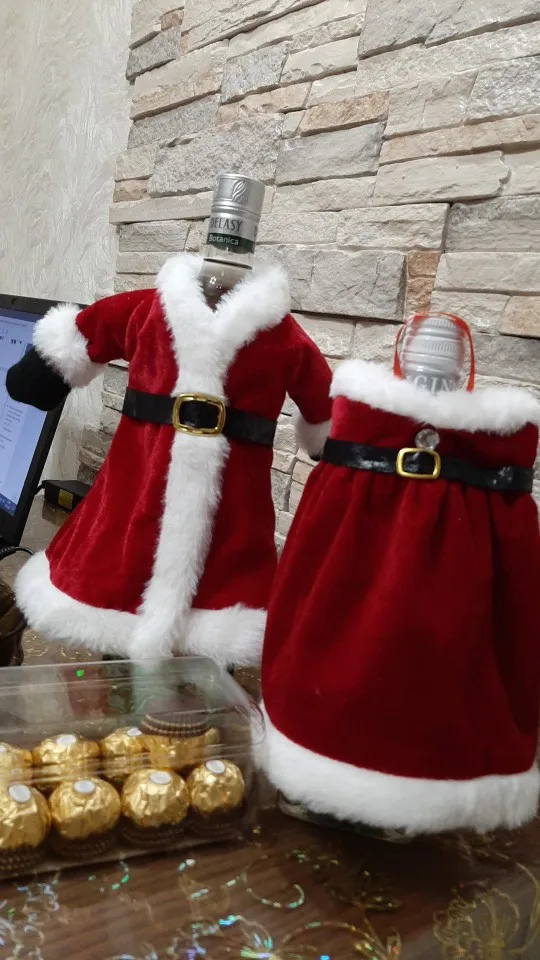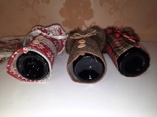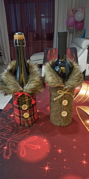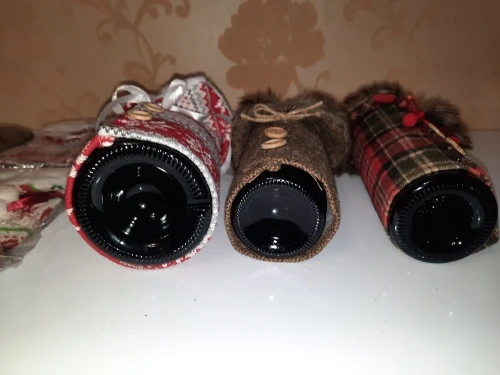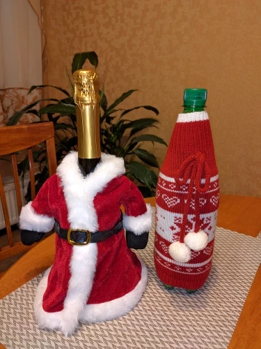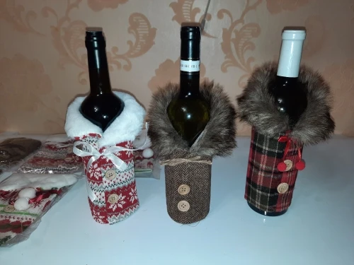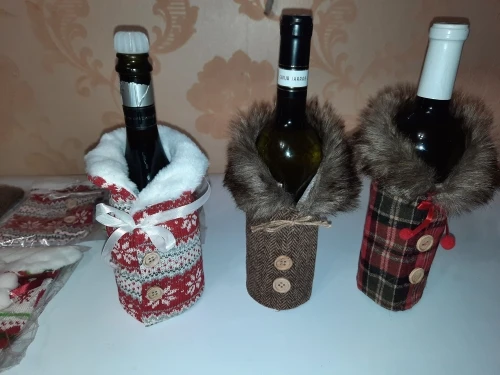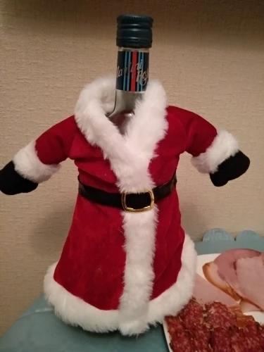 Одежка прикольная!!! Но есть несколько нюансов!!! Во первых нет дна! То есть если бутылка узкая,то легко может выскользнуть из рук (из чехла)! Ну и второй момент! Чехлы не тянутся! На обычной бутылке вина болтаются, на шампанское подороже(пузатые бутылки) не налезает! Хорошо сидят только на шампанском типа Советское, Ламбруска и ТД и ТП !!! Всех с Новым годом!!!