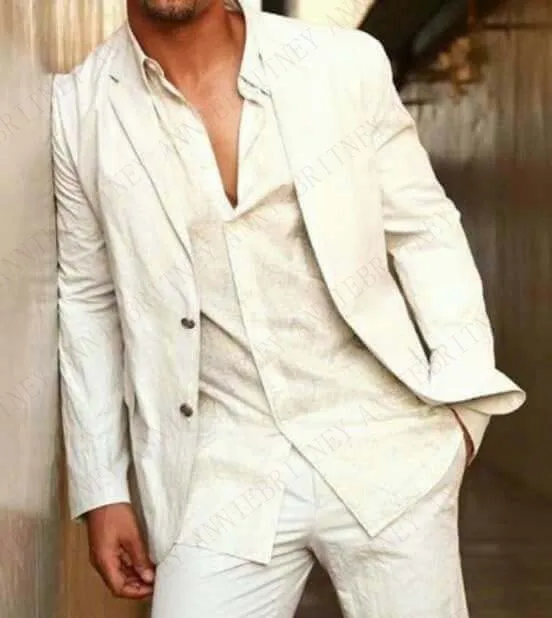 ANNIEBRITNEY, льняной цвет слоновой кости, летний мужской стиль, классический Пляжный смокинг, повседневная куртка, брюки, Индивидуальные костюмы большого размера