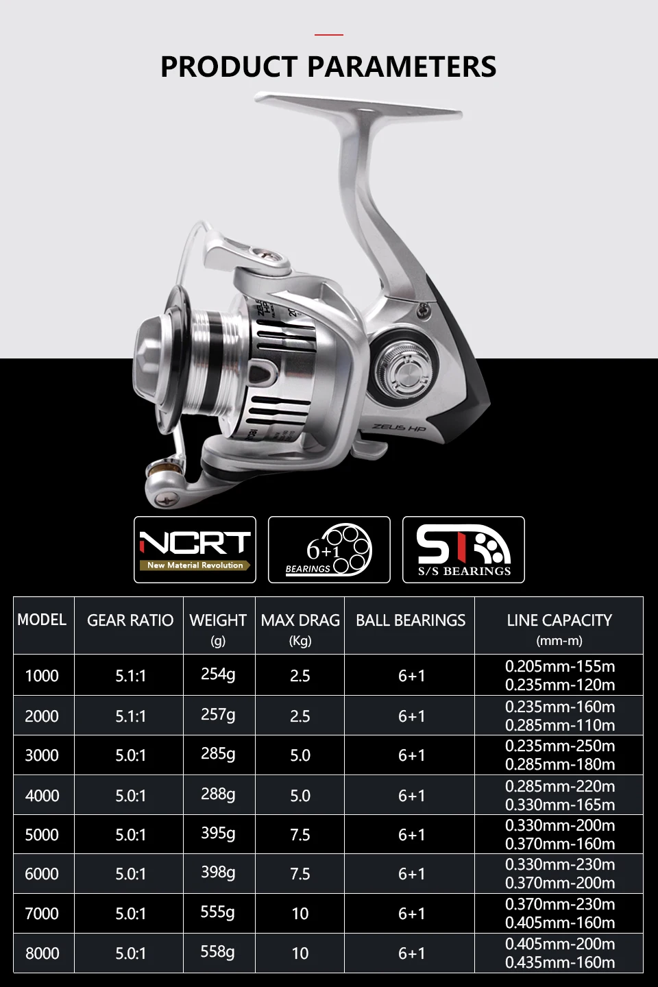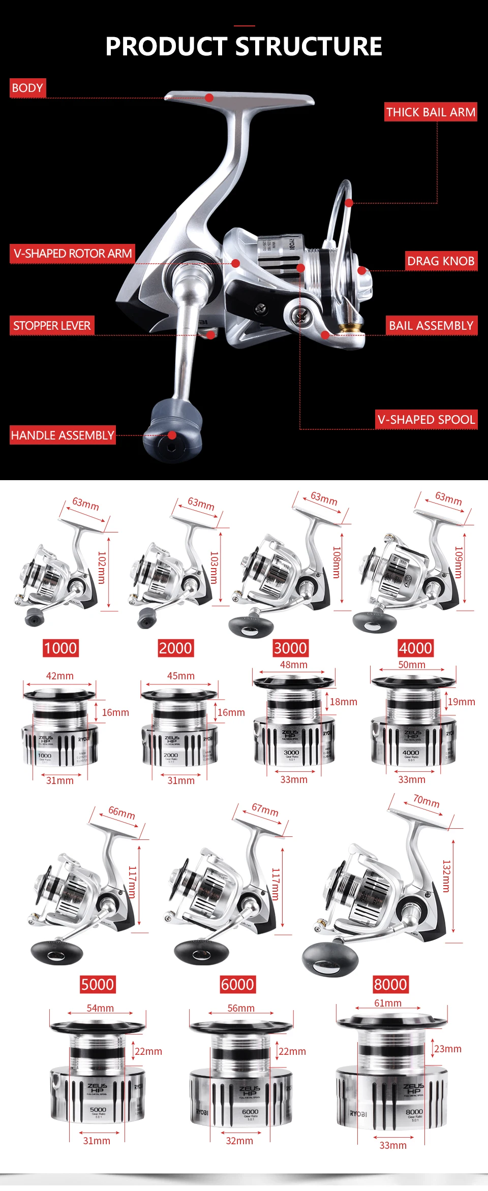 Катушка для спиннинга RYOBI ZEUS HP, 20003000400060008000, 6 + 1BB, макс. нагрузка 10 кг, 5,1: 15.0:1, водонепроницаемая, для соленой воды