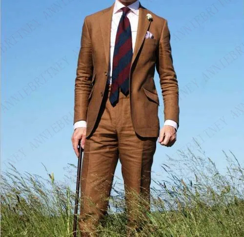 Мужской льняной костюм ANNIEBRITNEY, коричневый летний Свадебный костюм для мужчин, классический Пляжный смокинг, повседневный Блейзер, индивидуальный костюм большого размера, костюм 2019