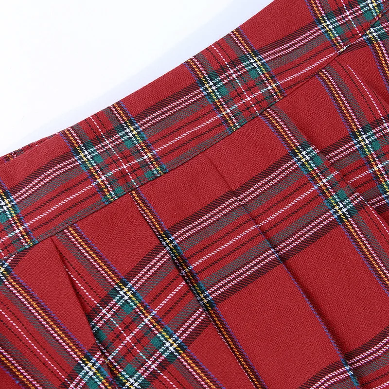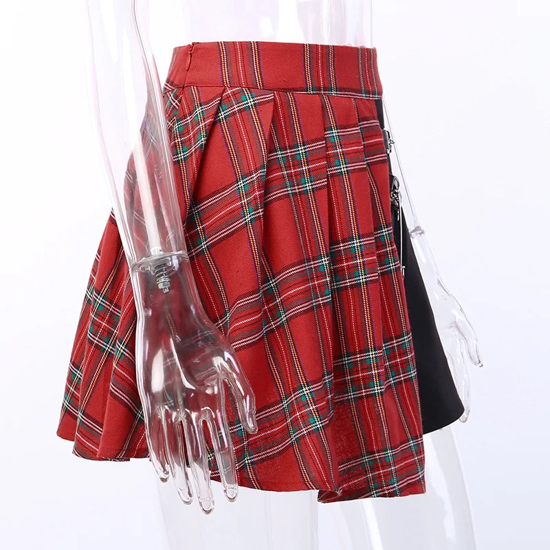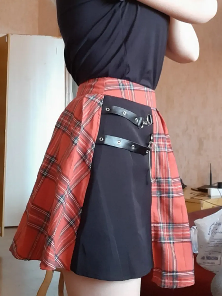 Красная клетчатая мини-юбка с поясом в стиле панк, плиссированная