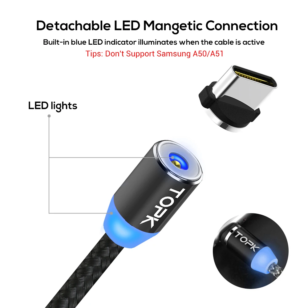 Магнитный светодиодный usb-кабель TOPK 1 мMicro USBType-C для iPhon...