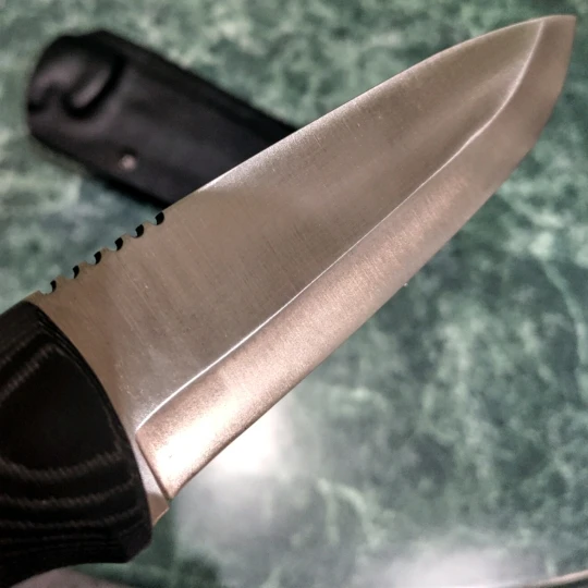 Годный ножик, сталь по твёрдости похожа на D2, насечками на обухе стеклянный пузырёк царапает. В общем рекомендую.