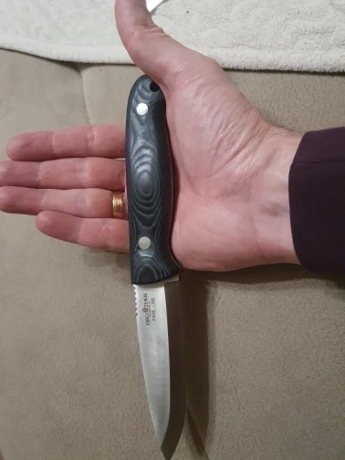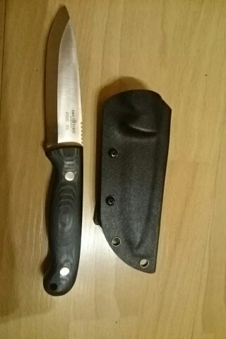 УкрПочта. Накладки не семетричны, подгонка ручная, ничего критичного. Зазор небольшой есть (со стороны клина). Слесарка не идеальна, но без серьезных проблем. Насечка на обухе с острыми гранями в таком виде будет рвать перчатки, дальше обух немного зализан (тут скорее как кому повезет). Похоже кайдекс, фаски снял сам, нет слива, не погремушка. Высокое крепление + тяжелый нож = рукоять будет перевешивать и выпирать ну и из-за высоты неудобно доставать, видимо придется делать свои. Холодноват, подпальцевая 6-7 мм., для шкуросъема изгиб мал (на грани, как померяют), угол схождения <70°. Буду убирать часть накладок, формировать метал. упор., тогда потеплеет.