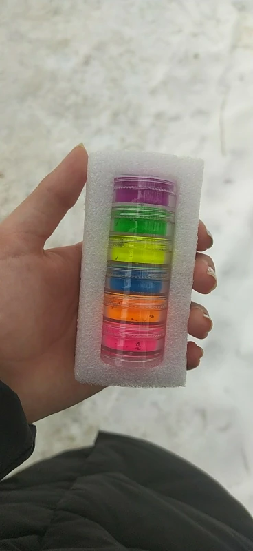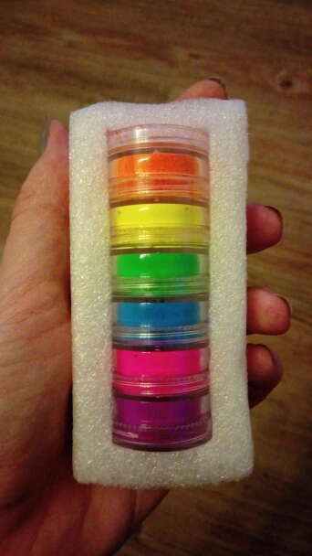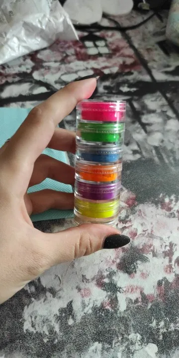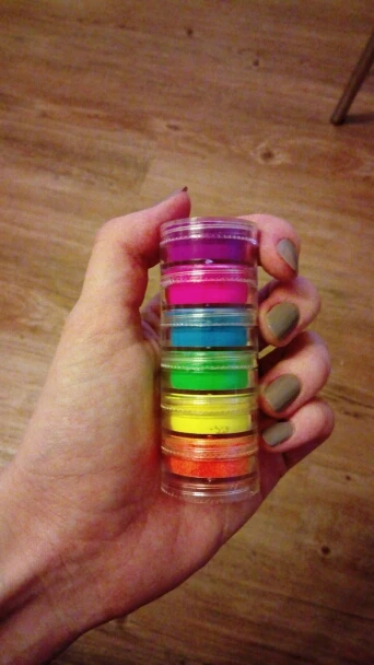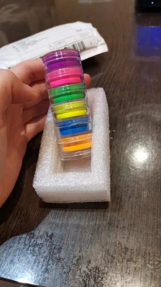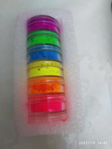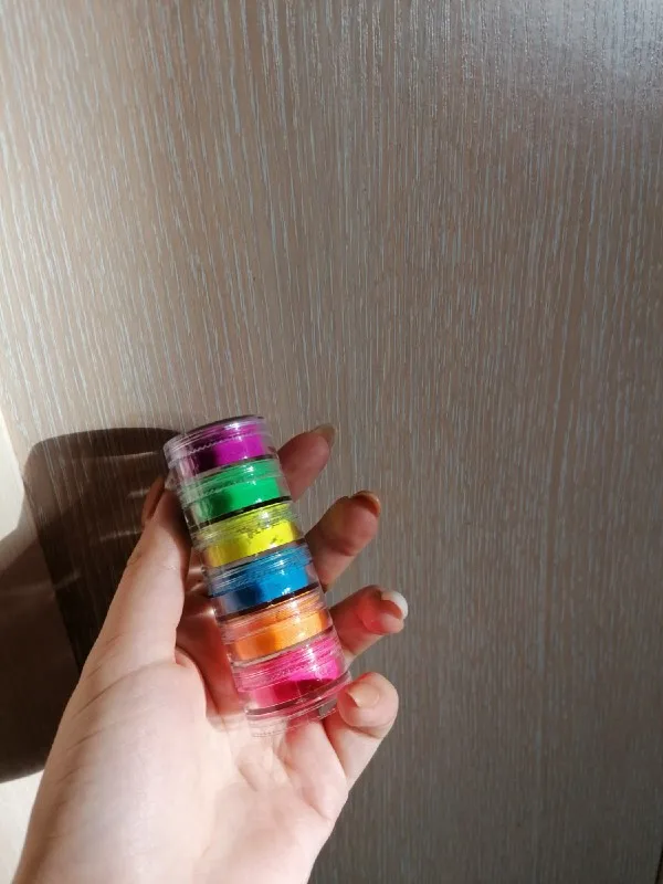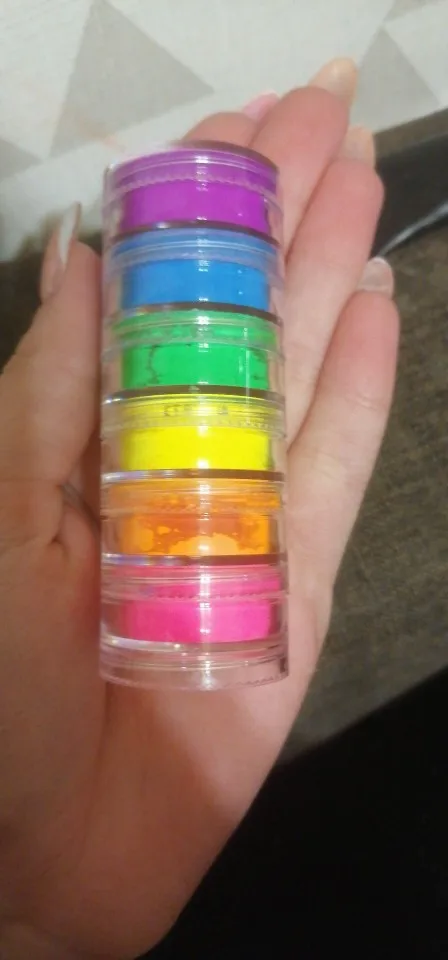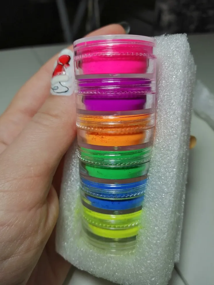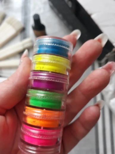 брала пигмент и формы для наращивания(120шт), обошлось мне в 38 рублей со скидкой, пигмент яркий,красивый, но очень не удобная упаковка, каждая баночка зависит друг от друга, на одной крышечке скол, но ничего не высыпается