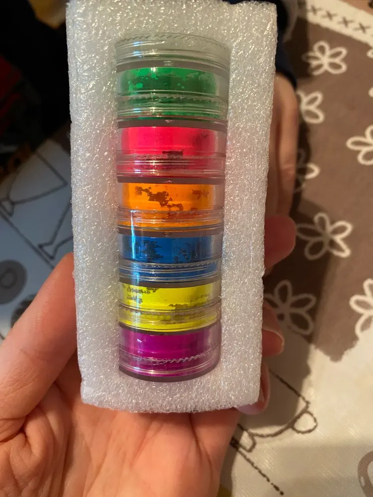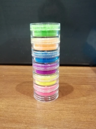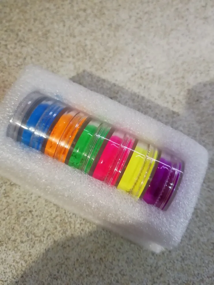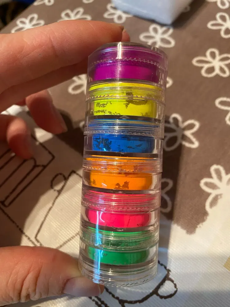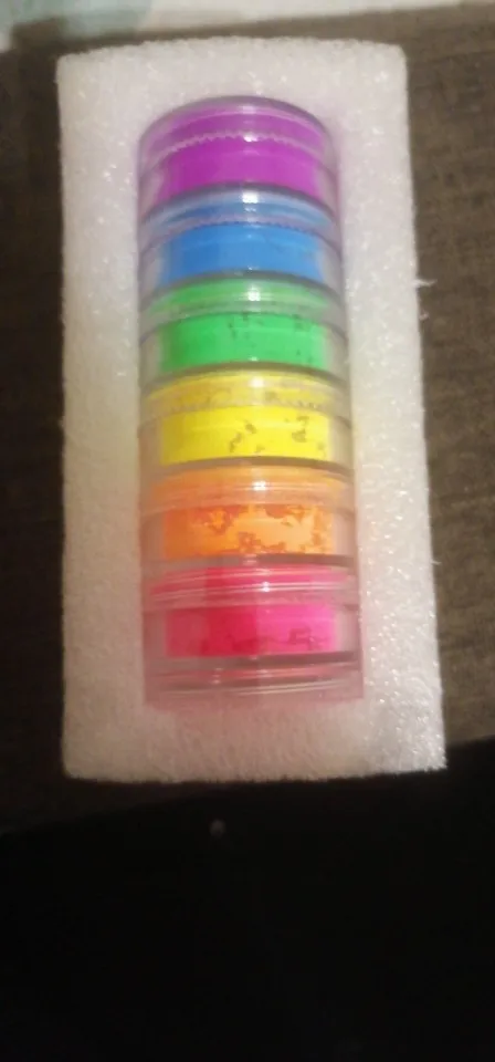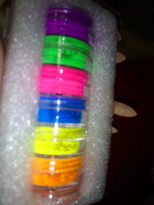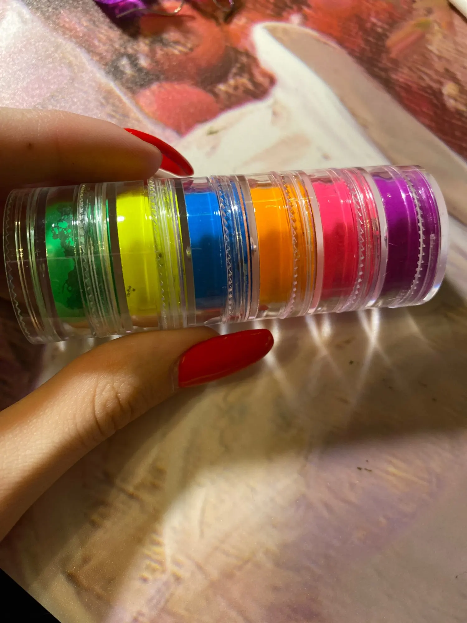 брала пигмент и формы для наращивания(120шт), обошлось мне в 38 рублей со скидкой, пигмент яркий,красивый, но очень не удобная упаковка, каждая баночка зависит друг от друга, на одной крышечке скол, но ничего не высыпается