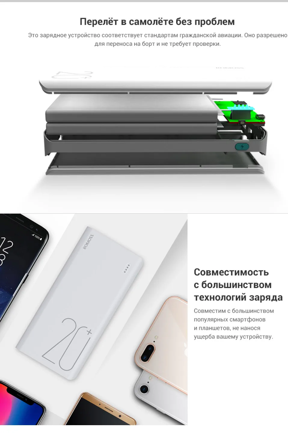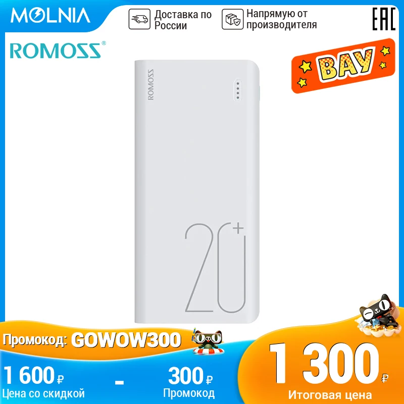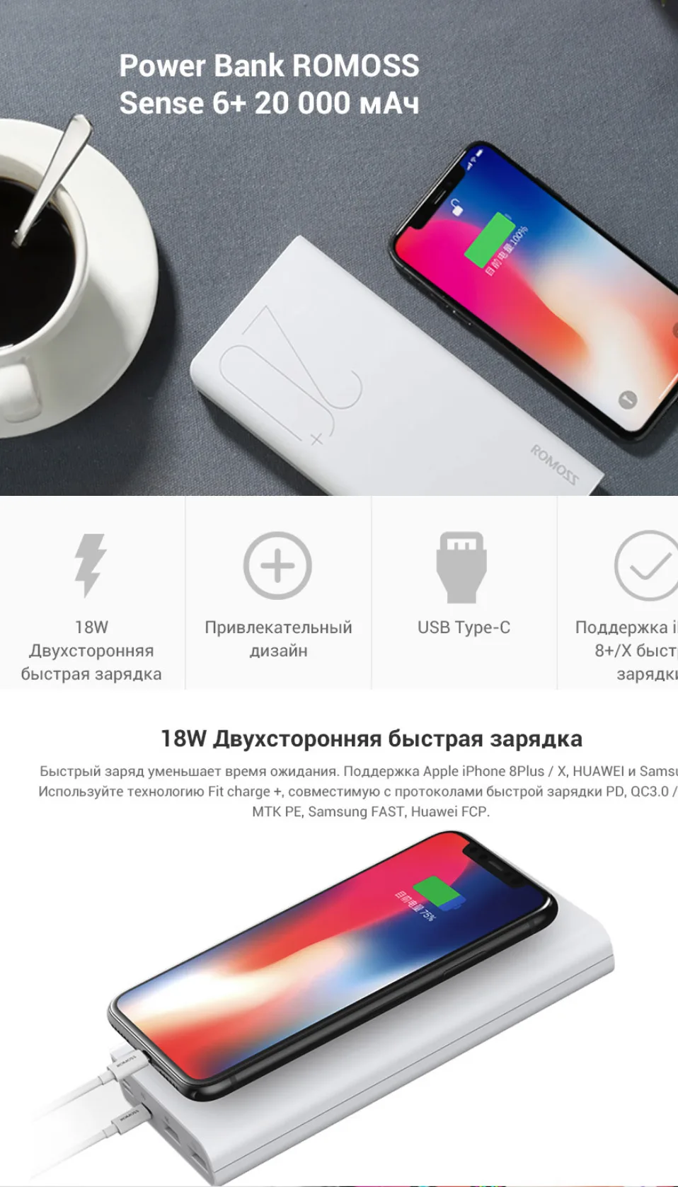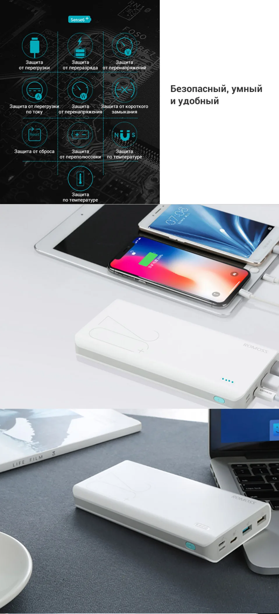 ROMOSS Sense 6+ 20000мАч power Bank с PD3.0 двухсторонняя Быстрая зарядка портативная зарядка доставка из России MOLNIA