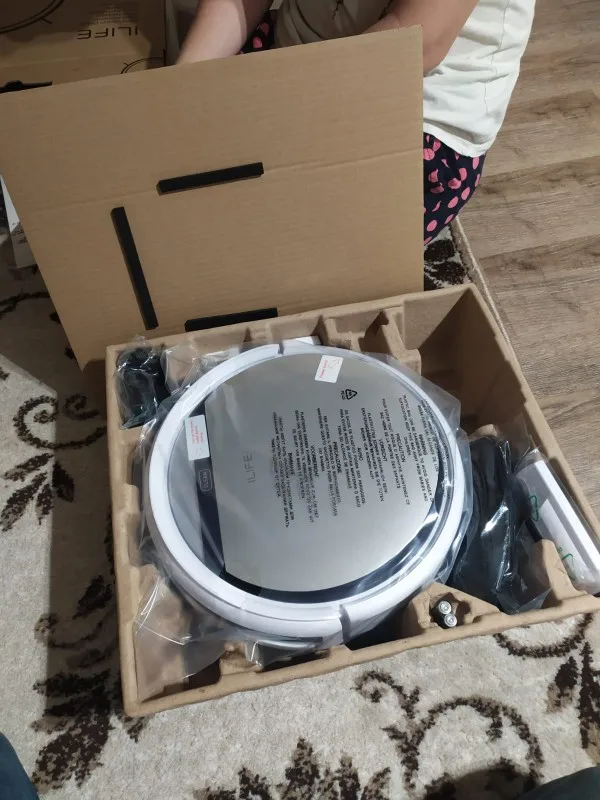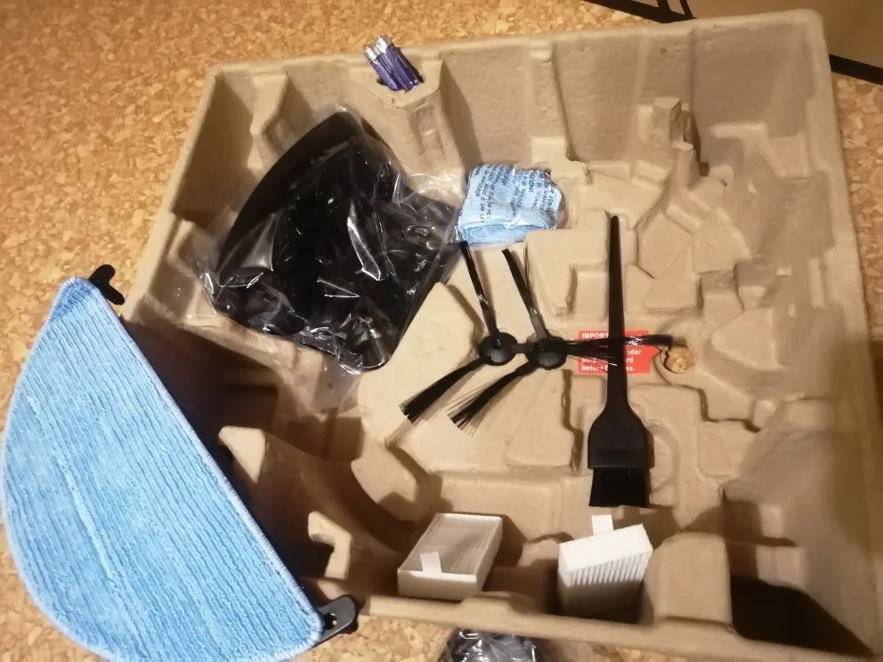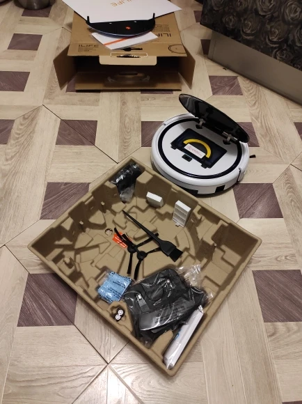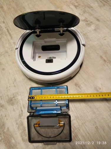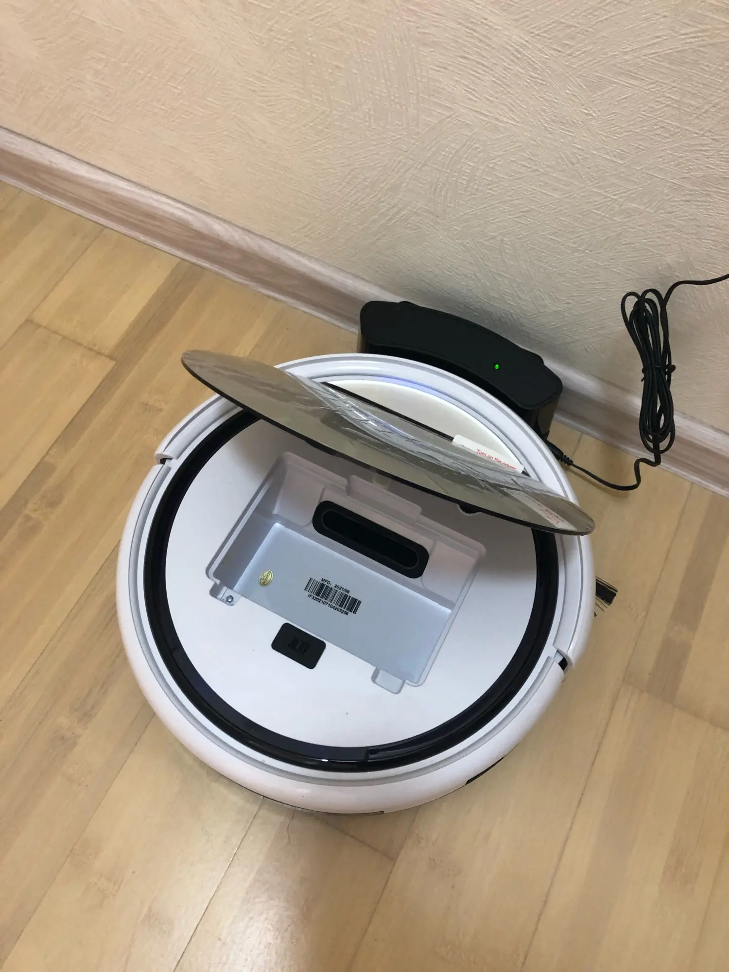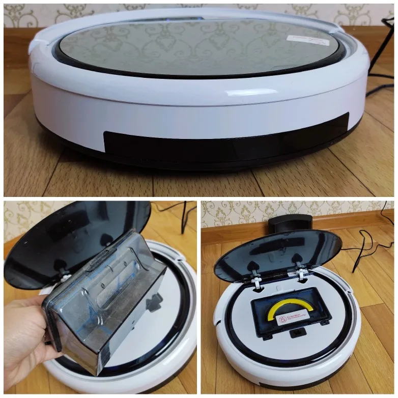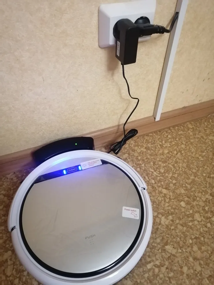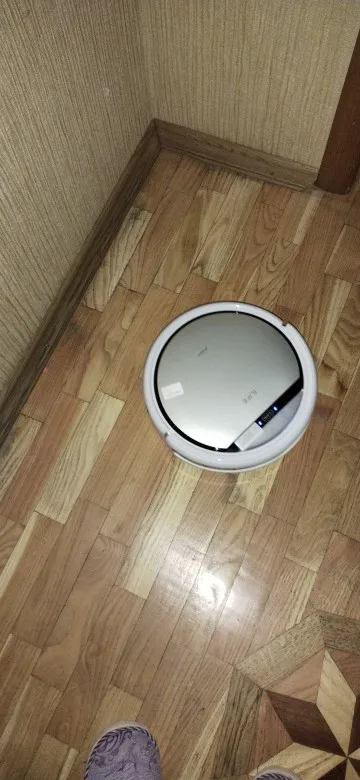 Ааааа! Он крутой! Покупала 11.11, но только чейчас удалось протестировать. Это первый робот-пылесос и брала я его в подарок. Ориентировалась на отзывы, рейтинг и приемлемую цену) пришёл очень быстро, забрала из Пятерочки. Упакован в картонную фирменную коробку с ручкой. В комплекте: пылесос, в нем собраный бокс под мусор, пульт, батарейки, две запасные крутящиеся щётки, два сменных фильтра, насадка для протирки пола с тряпочкой на липучке, база, провод для базы, щеточка для чистки, запасная тряпочка, и инструкция на русском языке с гарантийным талоном. По всей квартире тестить не стала, но на ковёр заезжает без проблем. Об стены не бьётся, немного притормаживает перед припятствиями и меняет траекторию. Тестила минут 5 и результат можно наблюдать на фото. Шумит не сильно, тише, чем мой беспроводной Эл джи. Пока не могу сказать, как находит базу, но обязательно дополню отзыв позже. На первый взгляд отличная вещь!