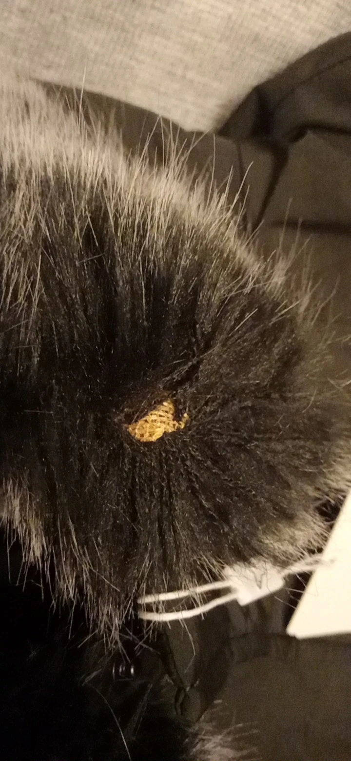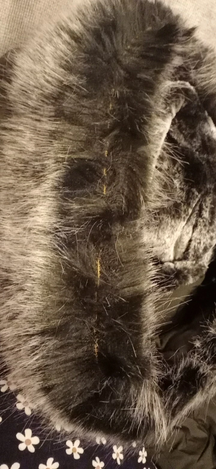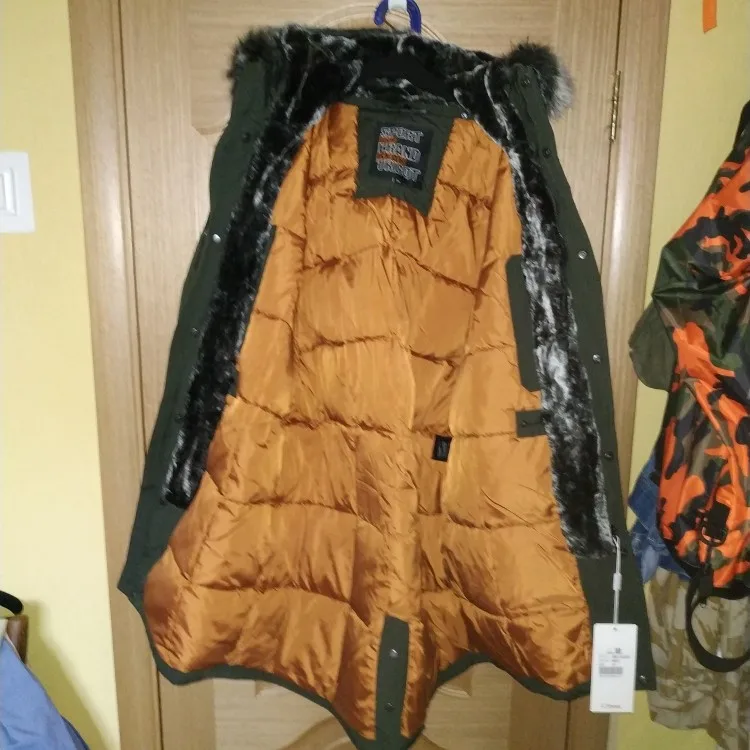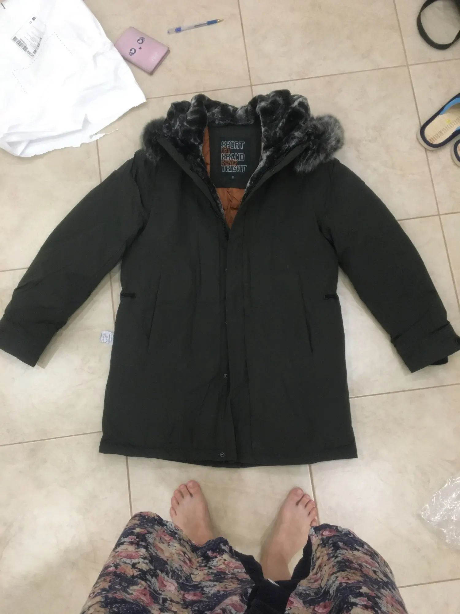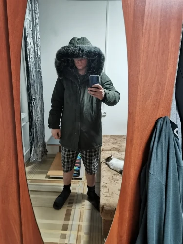 Мех сыпется в руках, если мех и меховой второй капюшон отстегнуть, то нормально выглядит. Классно внутри прошита, ровно. Но я ожидала другого качества куртку. Через обостренный спор оформила возврат, деньги вернули. Фото с мужем нет :D