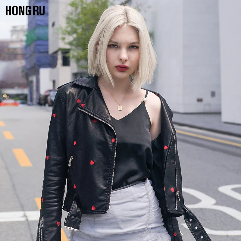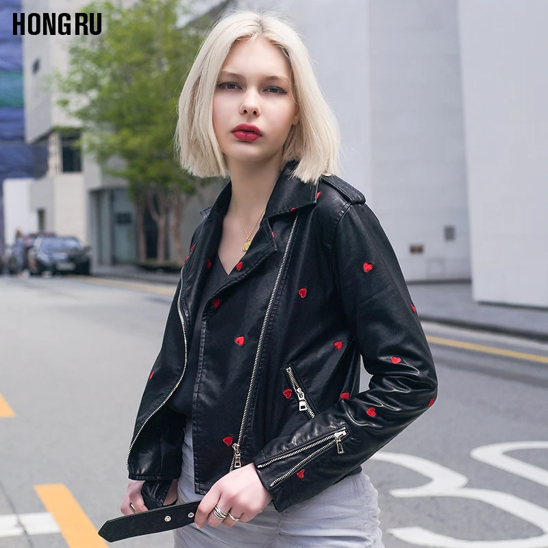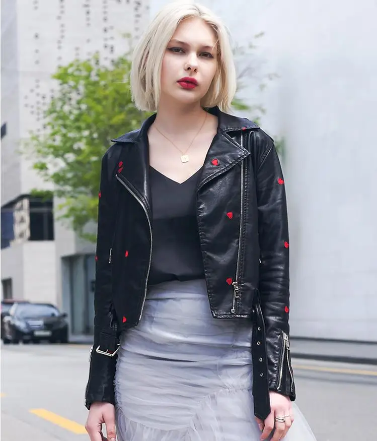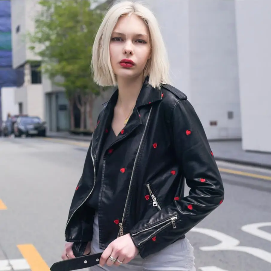 Осенняя новинка, Повседневная модная универсальная куртка из искусственной кожи с вышивкой Love, женские короткие мотоциклетные кожаные куртки, Прямая поставка, wq2489