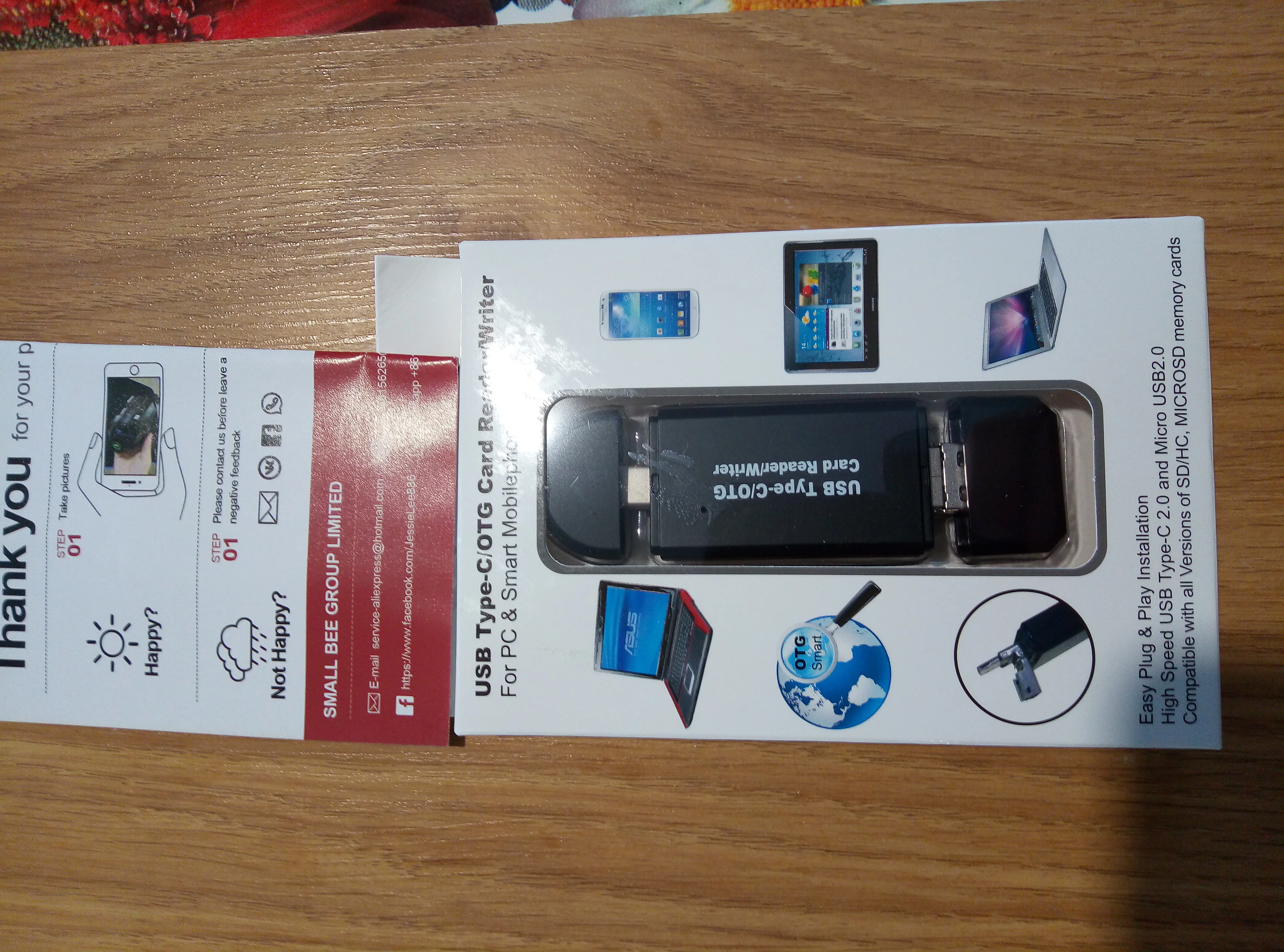 Картридер микро юсб внешне целый, но не работает. Проверил на двух телефонах, хотя месяц назад заказывал тут же другой - 3 в 1 микро юсб и тип с, работает без нареканий. Деньги вернули.