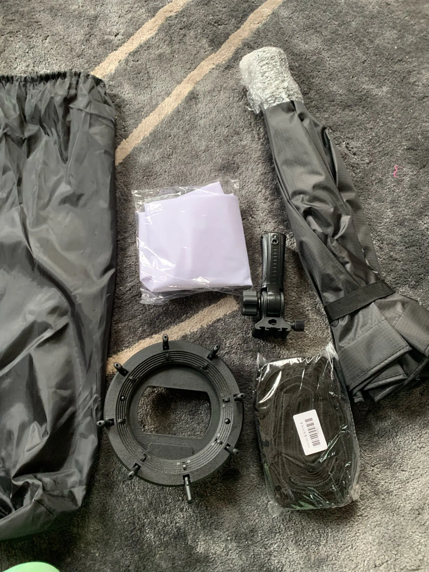 Пришло за 4 дня.Оперативно.Последние 2 спицы у софтбокса туго защёлкивается.А так товар полностью соответствует
