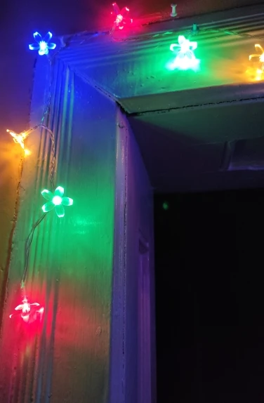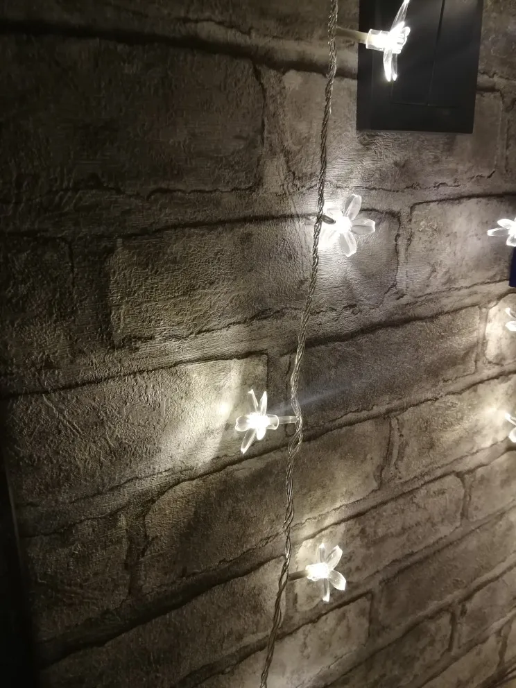 Отлично. Есть 50 ламп, около 9 см между ними. Я получил цветок, лепестки светятся из-за света. Цветок мягкий прозрачный силикон/резина. Свет довольно яркий и даже в дневное время можно увидеть. Есть неприятный пластиковый запах, и я все еще чувствую запах после подвешивания ламп, поэтому я зажег палку joss. Я уверен, что скоро будет снимать. Кажется хорошей сделкой для Йен 600. Я могу получить еще немного на Рождество.