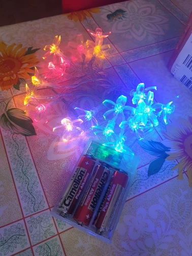 Гирлянда замечательная! Цветочки небольшие, сделаны из мягкого материала, так что не разобьются и не сломаются. Светятся разноцветными огоньками. Батареек в комплекте нет, нужны три батарейки АА. Два режима работы: постоянное свечение и мигание. Я очень довольна.