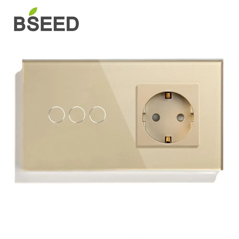 Настенный сенсорный выключатель BSEED европейского стандарта, 3 клавиши, 1 канал, 2 канала, розетка с прозрачной стеклянной панелью, 3 цвета, белый, черный, с перфорацией