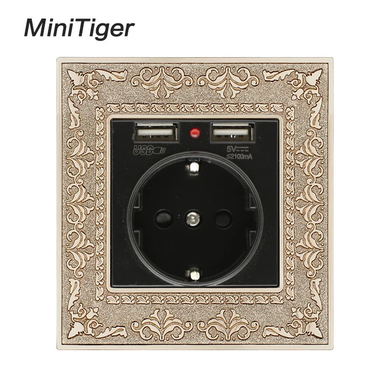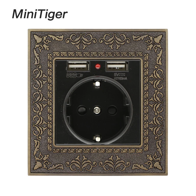 Высококлассная ретро-панель Minitiger из цинкового сплава, 16 А, черная настенная розетка европейского стандарта с двумя USB-портами для зарядки, рельефная панель