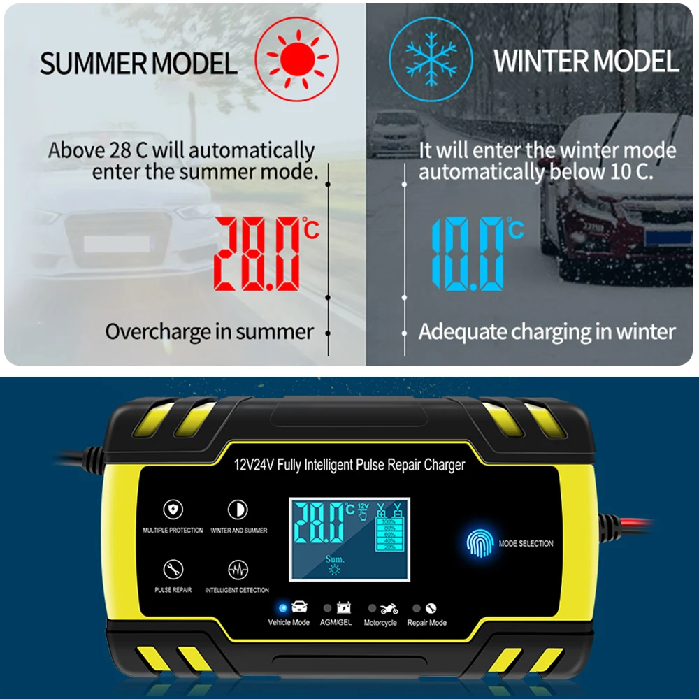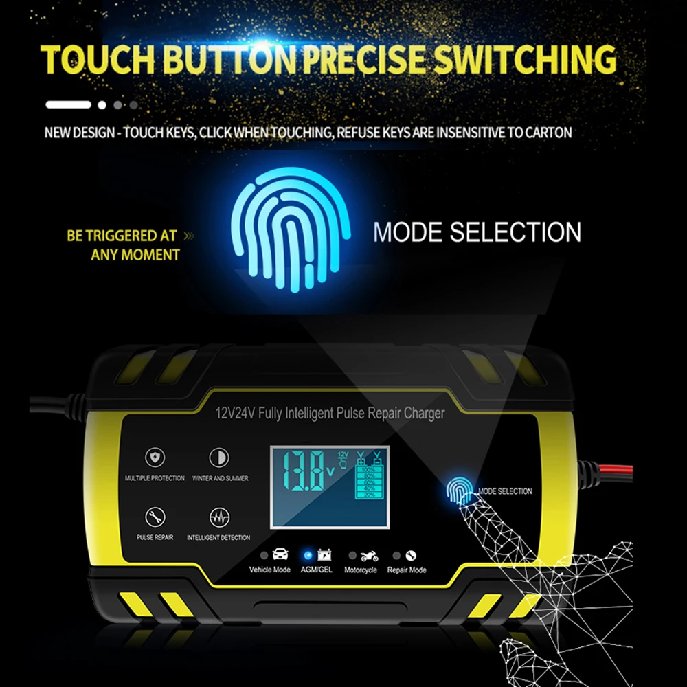 Зарядное устройство, 12 В, 24 В, импульсное, для ремонта, с ЖК-дисплеем, для мотоциклов и автомобилей, зарядное устройство для аккумуляторов AGM, гелевых, мокрых, свинцово-кислотных аккумуляторов